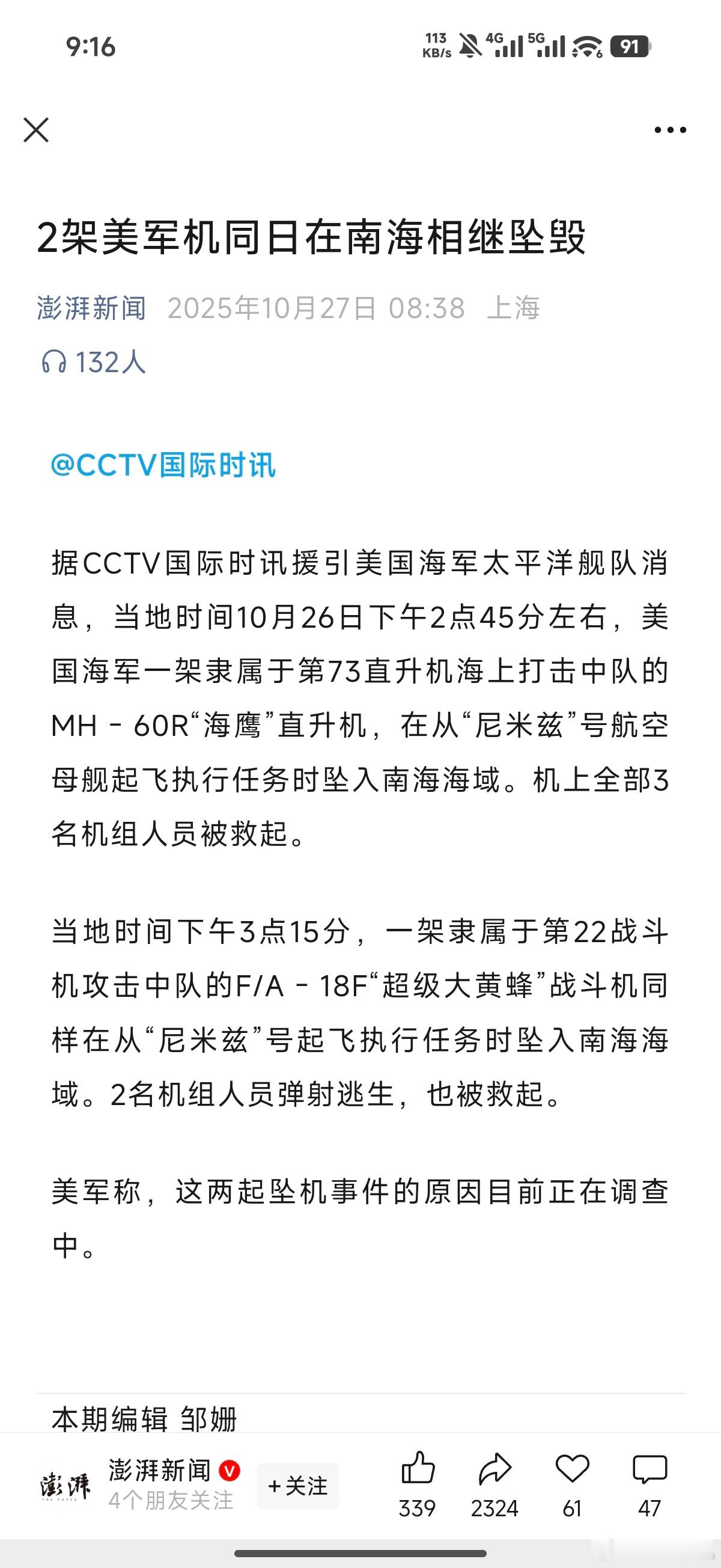 2架美军机在南海相继坠毁