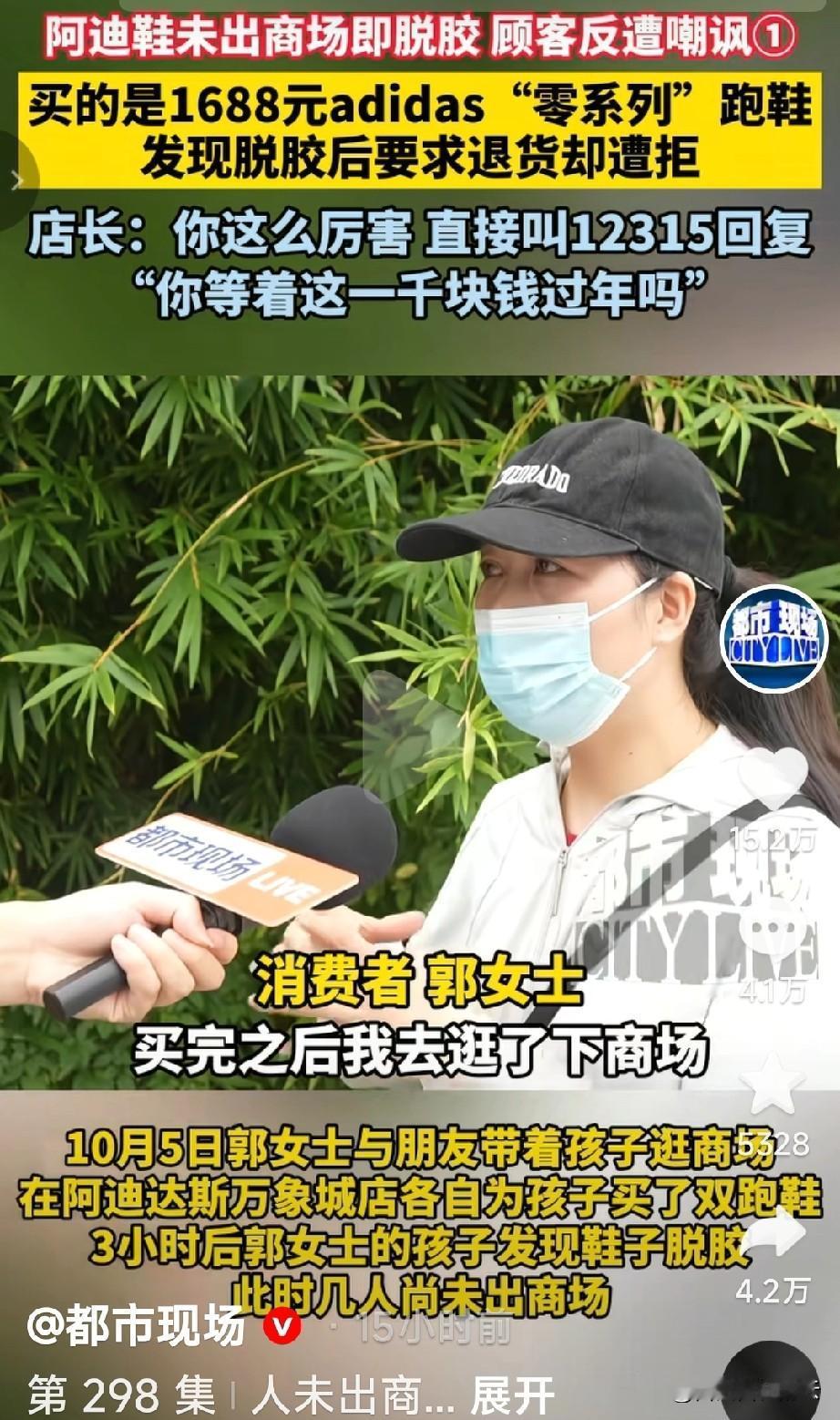 真嚣张!江西南昌,女子在万象城店的阿迪达斯给儿子买了一双1699的跑鞋。他们还没走出商场的大门,儿子就发现新鞋上开了一大道口子。 女子回店里换鞋,店员却不承认是鞋子的问题,质疑这道口子是用刀割的。 女子很生气,商场大门都没出,说是刀割的,这不就是怀疑我们弄的吗?她和店员理论时,发现店长和店员一直在发微信。她抢过手机,看到微信内容是,店长叫店员别理她,就这样耗着她。 女子很生气,花钱消费还被当面蛐蛐。她报警了,也打了12315,但是鞋子还是没退。她觉得心里憋屈,找到记者,当着记者的面,又给店长拨去了电话。电话里店长态度蛮横,他说你不是打了12315吗?就等着回复啊!这双鞋子又不是几万、十几万,也不是上百万的房子,你是等着这一千块钱过年吗? 我想问一下,店长你这个口气,你一个月能赚多少钱,是几万、十几万?一千多块钱在你眼里就这么不值钱了?再说这是钱的事吗?这是你对消费者的态度问题。 后面阿迪达斯巡店的工作人员把鞋子给退了,说是代表员工给女子道歉,是他们员工的话术不当。 有网友说,女子也太好说话了,这是话术不当的事吗?店长明显是骂人了。应该让店长亲自给顾客道歉。 我觉得也是,店长、店员都得给顾客道歉。特别是这个店长,在整件事里,一直是高高在上的态度,他把自己当上帝了。鞋子出现质量问题,不但不积极解决,反而污蔑顾客,还嘲讽顾客。这种人在店里,早晚把店搞黄。 对于这件事,你怎么看呢?