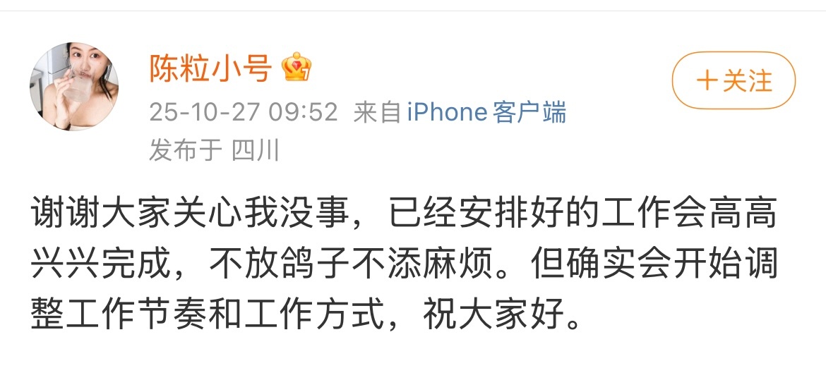 【#陈粒发文报平安#,#陈粒开始调整工作节奏和方式#】10月27日,再发文:谢谢大家关心我没事,已经安排好的工作会高高兴兴完成,不放鸽子不添麻烦。但确实会开始调整工作节奏和工作方式,祝大家好。此前报道,陈粒在音乐节演出中佩戴的耳返设备突发爆炸。视频中能看到,陈粒在演出过程中被吓了一跳。