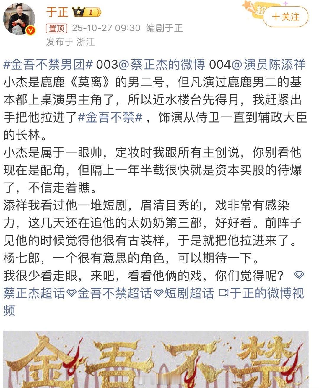 于正官宣电视剧《金吾不禁》的新角色,陈添祥加盟金吾不禁男团,这也是陈添祥的又一部古装剧作品,和白鹿《莫离》刚杀青,现在又进组《金吾不禁》,于正说白鹿男二基本都上桌了,看得出来白鹿是旺男搭档体质了啊~