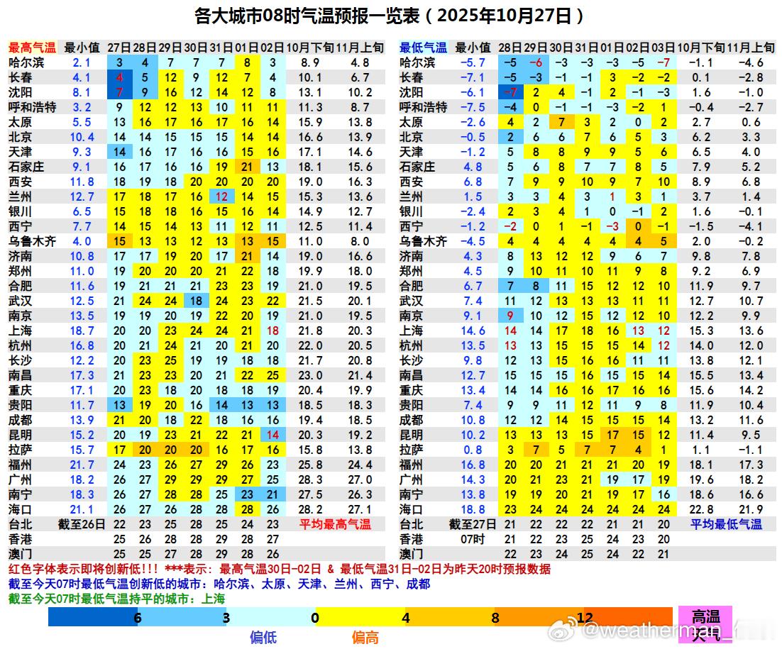 【气温创新低】今晨东北华北等地在冷空气影响下,气温下降。今晨截至8时有6个省会直辖市气温创立秋后的新低。其中,太原和西宁为立秋后首次破零。具体为:哈尔滨-5.7℃、太原-2.6℃、天津西青-1.2℃、西宁-1.2℃、兰州1.5℃、成都温江10.8℃。