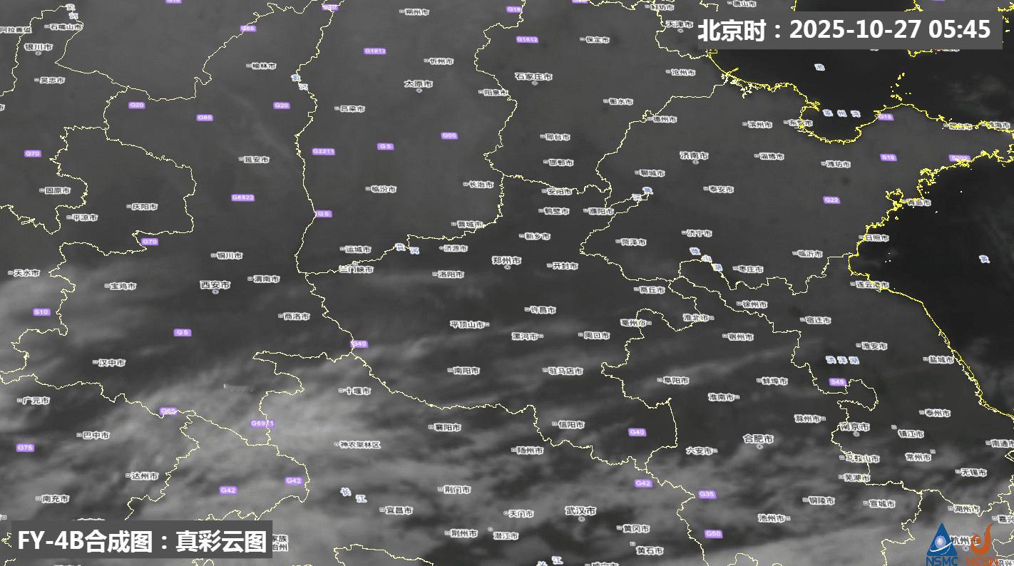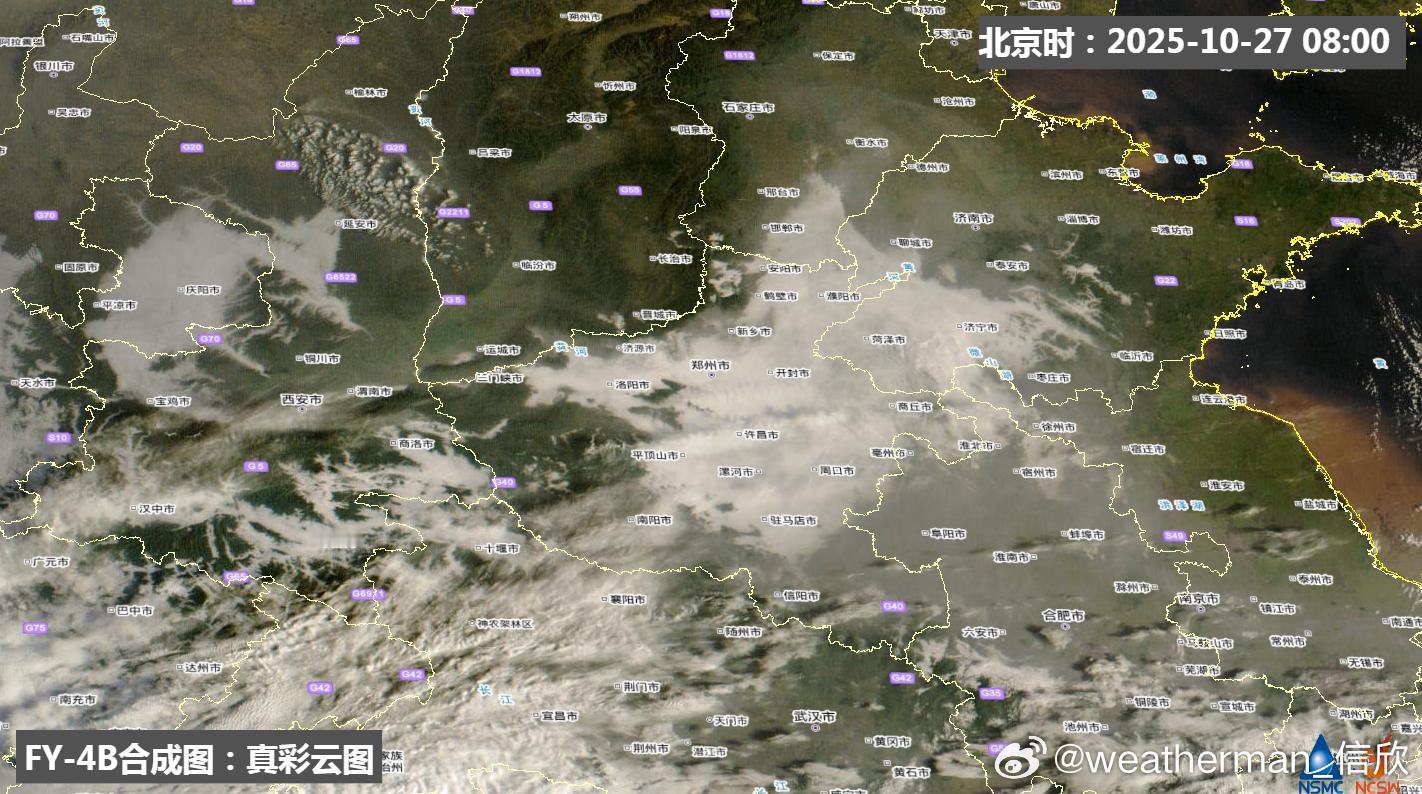 【大雾】今晨在河北南部、山东西部、河南北部和东部、湖北西北部、安徽北部、江苏北部以及甘肃东部、陕西中南部等地出现大雾。从卫星监测看,日出前,因为雾贴近地面,红外云图依靠温度差异,难以辨识雾,日出后改为可见光云图,白色的雾清晰可见(雾不动,云动)。今晨8时局地能见度不足100米。比如: