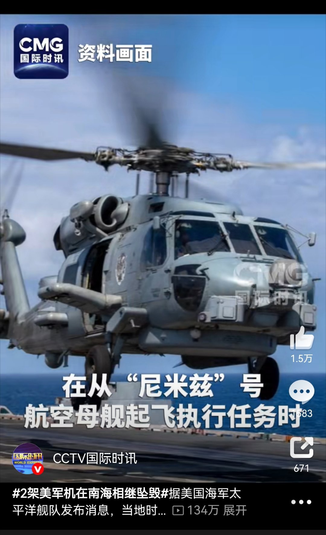 据美国海军太平洋舰队发布消息,当地时间10月26日下午2点45分左右,美国海军一架隶属于第73直升机海上打击中队的MH - 60R“海鹰”直升机,在从“尼米兹”号航空母舰起飞执行任务时坠入南海海域。机上全部3名机组人员被救起。
