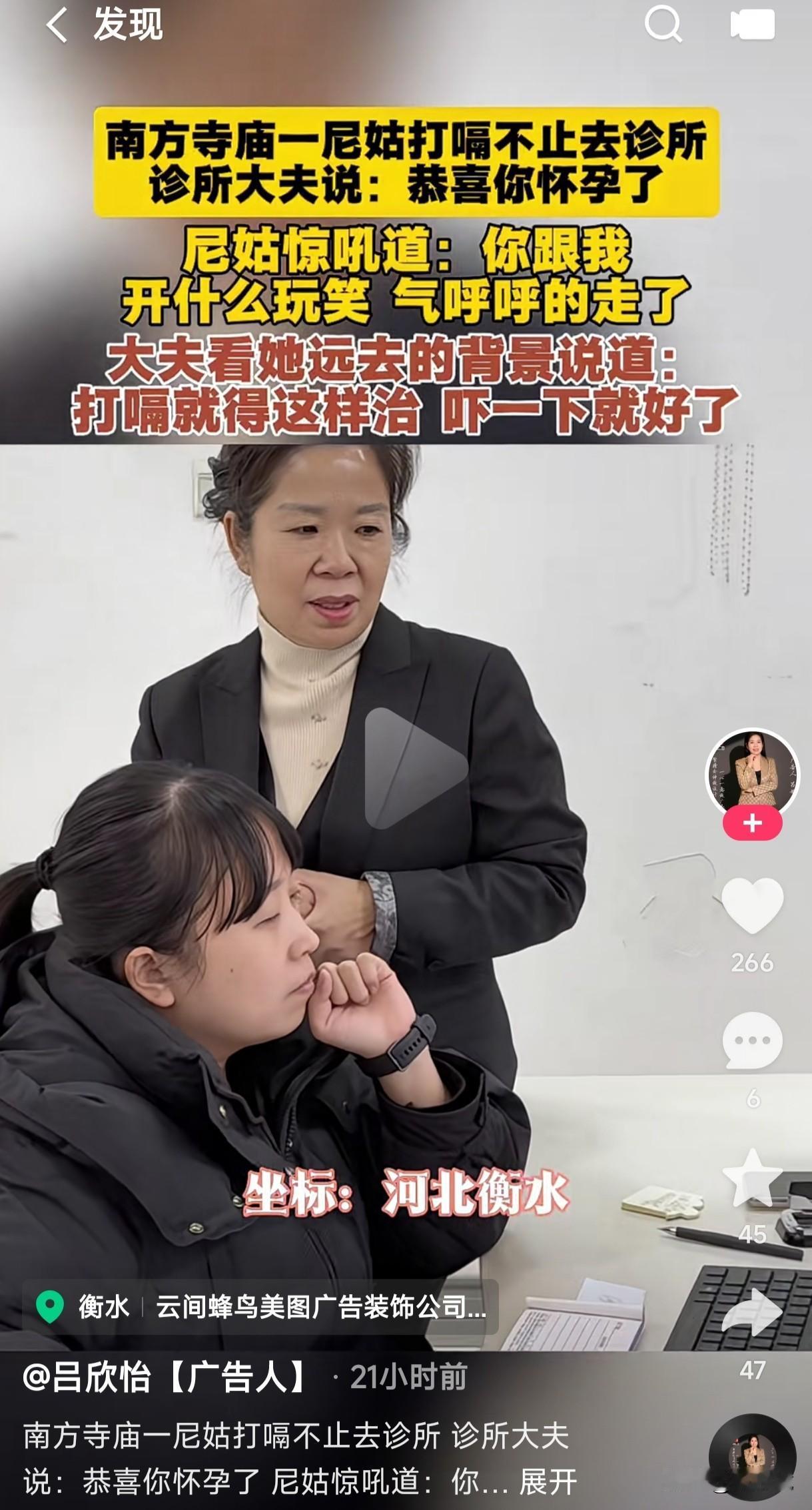 打嗝不止吓一下还真就好了 话说寺庙一尼姑打嗝不止去诊所找大夫 大夫说恭喜你怀孕了 尼姑惊吼道,开什么玩笑 然后气呼呼的就走了 大夫看着尼姑远去的背影说道 打嗝不止的吓一下就好了 这玩笑开的是不是有点太大了 大夫不应该给开点药吗 哪有上门看病不挣钱的道理 这万一把尼姑吓死了咋办