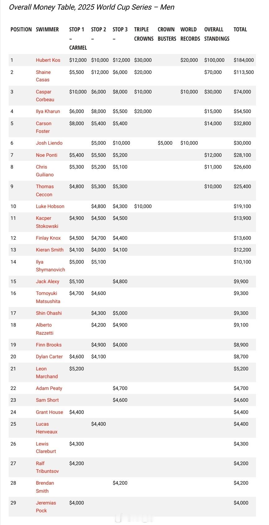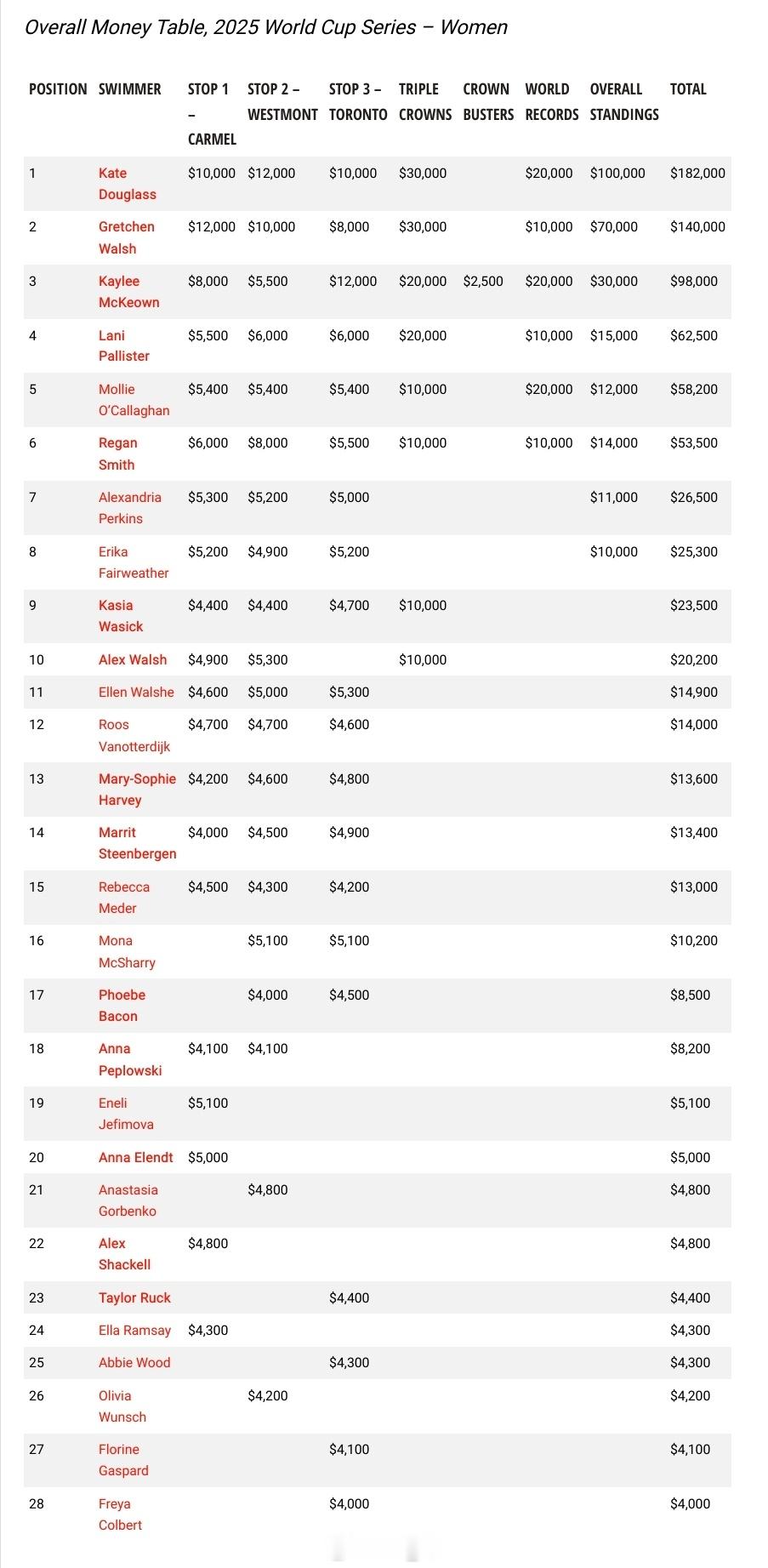游泳世界杯系列赛结束后选手获得奖金汇总