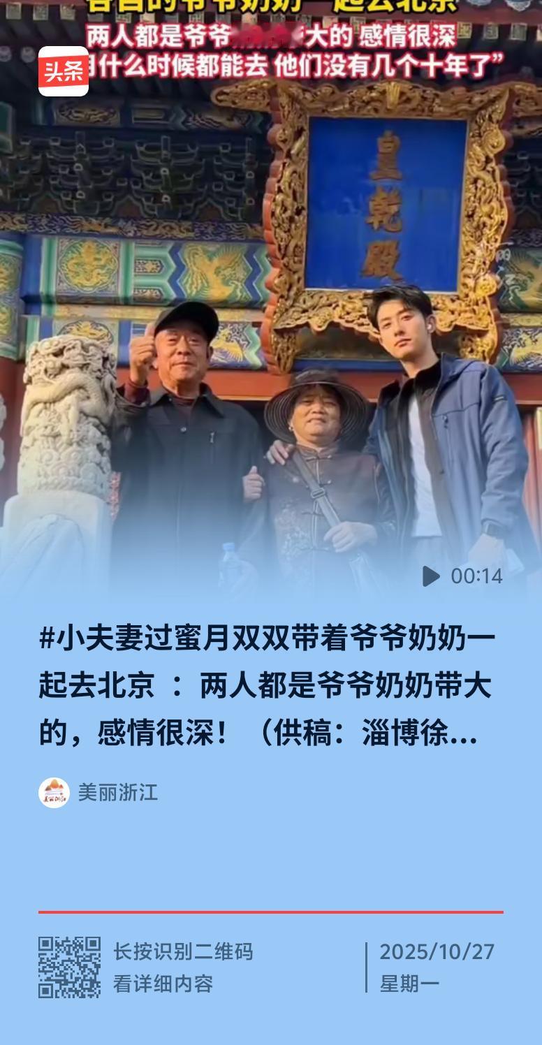小夫妻蜜月带爷爷奶奶去北京,这画面想想就温馨。就像那对80岁长春金婚老人国庆去北京度蜜月一样,他们凌晨3点看升旗,奶奶喂爷爷吃小吃,还一起吃月饼、和外国友人闲聊,全程自拍秀恩爱。小夫妻带着爷爷奶奶去,说不定也能留下很多美好的回忆。老人们或许能重温年轻时的浪漫,小夫妻也能在旅途中感受亲情的温暖。大家一起在北京的名胜古迹前合影,一起品尝北京美食,这蜜月之旅一定会格外难忘,说不定还能让两个家庭的感情更上一层楼呢。