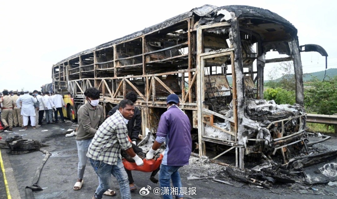 10月24日上午,印度东南部安得拉邦库尔努尔地区的高速公路,一辆双层长途巴士在行驶途中撞上前方摔倒的摩托车后起火。车上42名乘客,19人被困车内丧生,其余乘客破窗逃生。