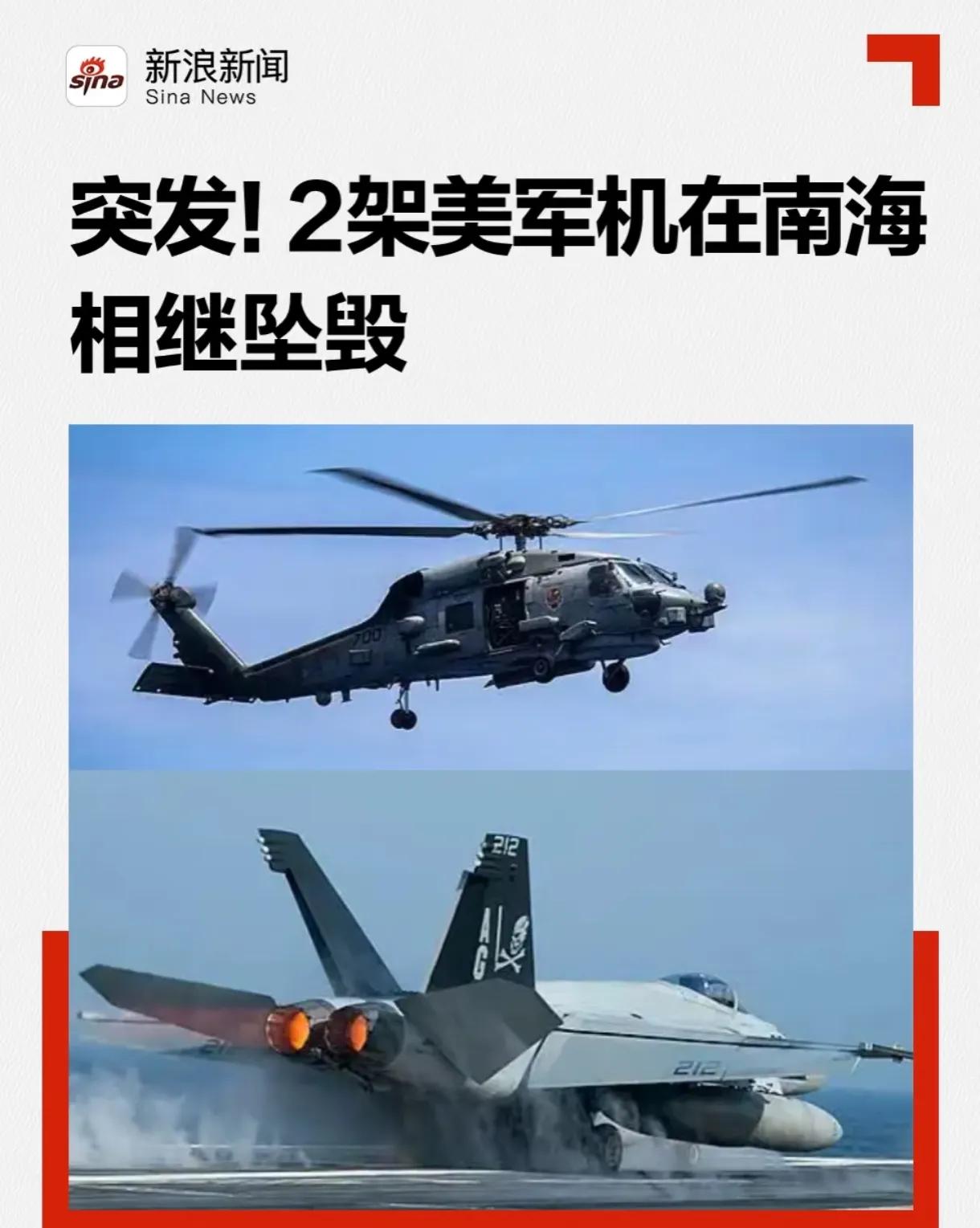 鹰酱连摔两架飞机太诡异,先是MH-60R海鹰直升机,然后是F-18A超级虫战机。 这个行动模式,一般都是直升机做预警探路,未知原因坠毁了,放飞战机去查情况,又坠毁了,原因很明显。 要么是鹰酱已经废到家了,随意选两架飞机,全是废品,废品率接近100% 要么就是对面的未知手段,方法未知,过程未知,只能知道结果……