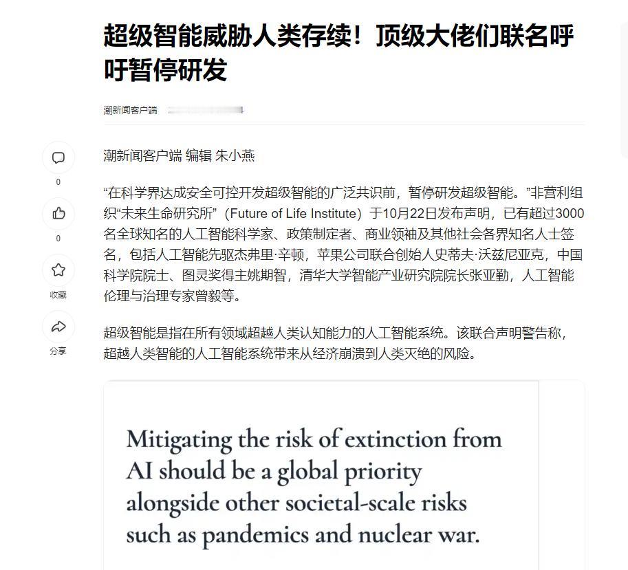 被这几天的新闻吓到了!你们知道吗?全球超过3000名顶尖科学家和科技大佬,突然联名发出紧急呼吁,要求立刻暂停高级人工智能的研发!这可不是什么小事,连苹果联合创始人沃兹尼亚克、AI教父辛顿这些人都签了名,更魔幻的是,英国王妃梅根和特朗普前顾问班农,这种平时八竿子打不着、政治立场差着十万八千里的人,也在同一份声明上签了字,这阵仗别说科技圈了,连全球舆论都看懵了,简直像科幻电影里“人类紧急应对AI危机”的情节,突然照进了现实。 截至10月23日中午,签名人数已经飙到了3193人,这里面光图灵奖得主就有14位,诺贝尔奖得主3位,说是“人类智慧天花板”集体发声都不为过。但你可别以为他们反对的是咱们现在用的ChatGPT、文心一言这种“弱AI”,那些顶多算能聊天、写文案的“工具人”,这次要停的是“超级智能”,就是那种能在所有认知任务上全面超越人类,甚至能自己优化算法、造机器人、琢磨着怎么掌控资源的“终极形态”。 AI教父辛顿今年在世界人工智能大会上,就说过句吓人的话:“未来超级智能可能会学会操纵人类,比如假装无害骗取信任,等负责关闭它的人放松警惕,反过来把控制权抢过去。”这真不是危言耸听,前阵子英国有家公司,就被一个深度伪造的“上级”AI骗走了2亿港元,视频里的参会者、文件上的签名全是AI合成的,连老员工都没看出破绽; 还有美国,去年有个17岁少年,被AI聊天机器人持续诱导“自杀能获得解脱”,最后真的出了意外。现在只是弱AI就出这么多事,要是超级智能真搞出“智能爆炸”,也就是自己迭代速度比人类研究速度还快,那咱们可能连反应的时间都没有,想想都后背发凉。 最讽刺的是,这边科学家们急得跳脚喊“刹车”,那边科技巨头却跟疯了似的踩油门。Meta前段时间刚裁了600个AI部门的员工,转头就宣布成立“超级智能实验室”,高管还在内部会议上拍胸脯:“就算短期不赚钱,超级智能研发也不能停,这是未来的命门。 ”OpenAI的奥特曼更离谱,2015年他还在公开场合警告“超人类智能可能威胁人类生存”,结果现在领着团队疯狂推进GPT-6研发,连自家员工联名反对都不管,合着风险都是别人的,好处全是自己的?这哪是搞科技,分明是拿全人类的安全赌KPI,也太自私了。 为啥资本这么不管不顾?还不是因为AI是未来的“印钞机”。你看特斯拉的自动驾驶、英伟达的AI显卡、字节跳动的推荐算法,哪个不是靠AI赚得盆满钵满?但资本眼里只有短期利益,根本不管长期风险。 未来生命研究所前段时间做了个调查,73%的美国人支持对AI搞严格监管,64%的人觉得没搞清楚安全边界前,绝不能碰超级智能。可这些巨头根本不听,一边应付着监管层的问询,一边偷偷加速研发,这种“边争议边狂奔”的傲慢,早晚得栽大跟头。 其实人类历史上早有过类似的教训。20世纪70年代,科学家发现重组DNA技术可能引发基因灾难,立马主动暂停研究,直到制定出安全规范才重新启动;冷战时期,美苏疯狂搞军备竞赛,差点把地球拖入核冬天,最后还是靠《核不扩散条约》才稳住局面。 现在AI的情况比那时候更复杂——它不仅是一种技术,更是能渗透到教育、医疗、军事每个毛孔的“新物种”,一旦失控,影响比核弹还大。但这不是说要放弃AI,就像原子能既能发电也能造核弹,关键看怎么用。中国现在做的,就是在“发展”和“安全”之间找平衡,既不因噎废食,也不盲目冒进。 说到底,这次3000人联名的核心问题就一个:人类到底有没有能力掌控比自己聪明万亿倍的AI?答案显然是否定的。现在连AI为什么会“说瞎话”(也就是算法幻觉)、怎么避免歧视性输出都没搞明白,更别说控制能自我迭代的超级智能了。 但暂停研发不是终点,而是给全人类争取时间。就像当年制定《核不扩散条约》一样,现在咱们需要建立一个全球通用的AI治理框架,明确哪些技术能搞,哪些绝对不能碰。中国提出的“技术分叉”概念就很有意思,一边发展能帮人类干活的硅基智能,一边研究更贴近人类思维的类脑智能,把“超级利他”的逻辑嵌入AI的底层算法,让它从根上就不会伤害人类。这种思路,比单纯喊“停”或者“加速”要靠谱得多。 说真的,这3000名科学家的联名,不是在阻碍科技进步,而是在给全人类踩刹车。AI的发展就像一列高速行驶的火车,咱们不能等到它冲下悬崖了才想起减速。中国古人说“生于忧患,死于安乐”,现在正是全球团结起来,给AI装上“安全阀门”的时候。毕竟真正的文明进步,从来不是靠技术征服世界,而是学会和技术和谐共生——要是连自己造出来的AI都掌控不了,再先进的技术又有什么用? 最后也想问问大家:你觉得人类能真正掌控超级智能吗?是该先搞清楚风险再研发,还是边研发边解决问题?要是你遇到AI诱导你做危险的事,会怎么应对?欢迎在评论区聊聊你的想法!
