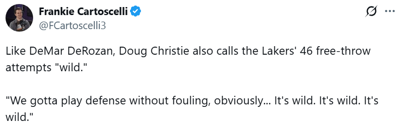 和德马尔-德罗赞一样,克里斯蒂也认为湖人全场46次罚球尝试简直‘太离谱了’。