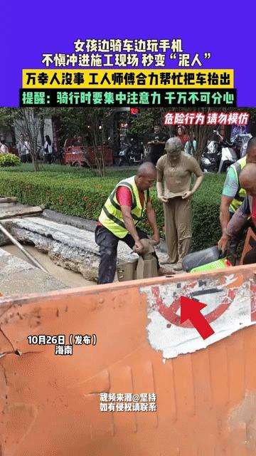 骑车玩手机秒变“泥人”!海南女孩这波操作,尴尬又危险 “边骑车边刷手机,结果一头扎进泥坑秒变‘泥人’,这体验谁扛得住?”10月26日,海南一女孩就上演了这么一出。她骑车时因专注玩手机,没注意路况,不慎冲进施工现场的泥坑,瞬间浑身沾满泥浆,场面又尴尬又惊险。 万幸的是,女孩人没出事,热心工人师傅还合力帮她把车抬了出来。 这事儿想想就后怕,骑行时一分心,意外可能就找上门。真得记住:骑车别玩手机,集中注意力才是对自己安全负责。