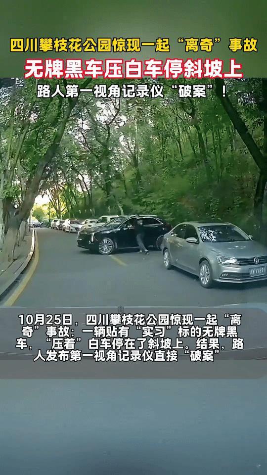 攀枝花公园“车骑车”离奇事故:无牌实习黑车压白车停斜坡,路人记录仪全程“破案”