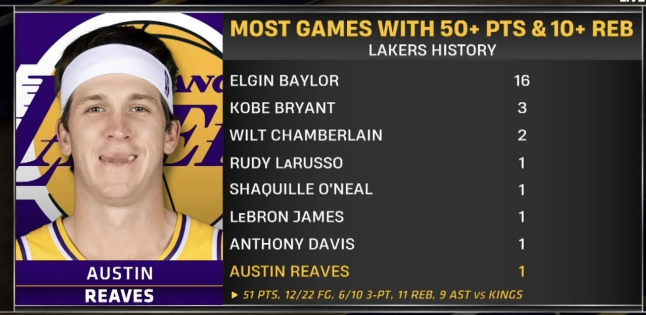 小李子比肩湖人名宿!10月27日,湖人客场127-120战胜国王。奥斯汀-里夫斯惊艳全场!他首发出场39分钟,在没有大哥詹姆斯和核心东契奇的情况下,全场22投12中,其中三分球10投6中,罚球22罚20中,豪取51分10篮板9助攻2抢断的詹姆斯式数据,得分历史新高,正负值+更是惊人的22。这样出色的表现也让里夫斯比肩奥尼尔和詹姆斯科比等球员,成为湖人队史第八位单场砍下50分10篮板的球员。在东契奇和詹姆斯都不在德情况下,里弗斯确实扛起了球队,与内线核心艾顿共同奉献一场经典比赛。东契奇和詹姆斯不在,湖人的化学反应还能如此,确实意想不到!东契奇回归后,里弗斯和艾顿就很艰难挣扎。这是雷迪克急需解决的问题!湖人里夫斯 詹姆斯历史地位如何