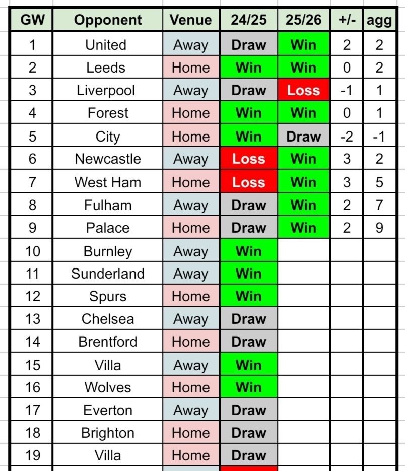 相比上赛季,前9轮在相同场地面对相同的对手,阿森纳多拿了9分。