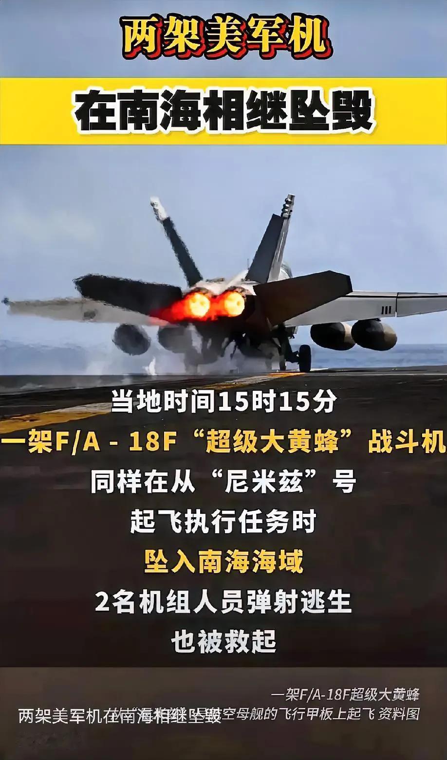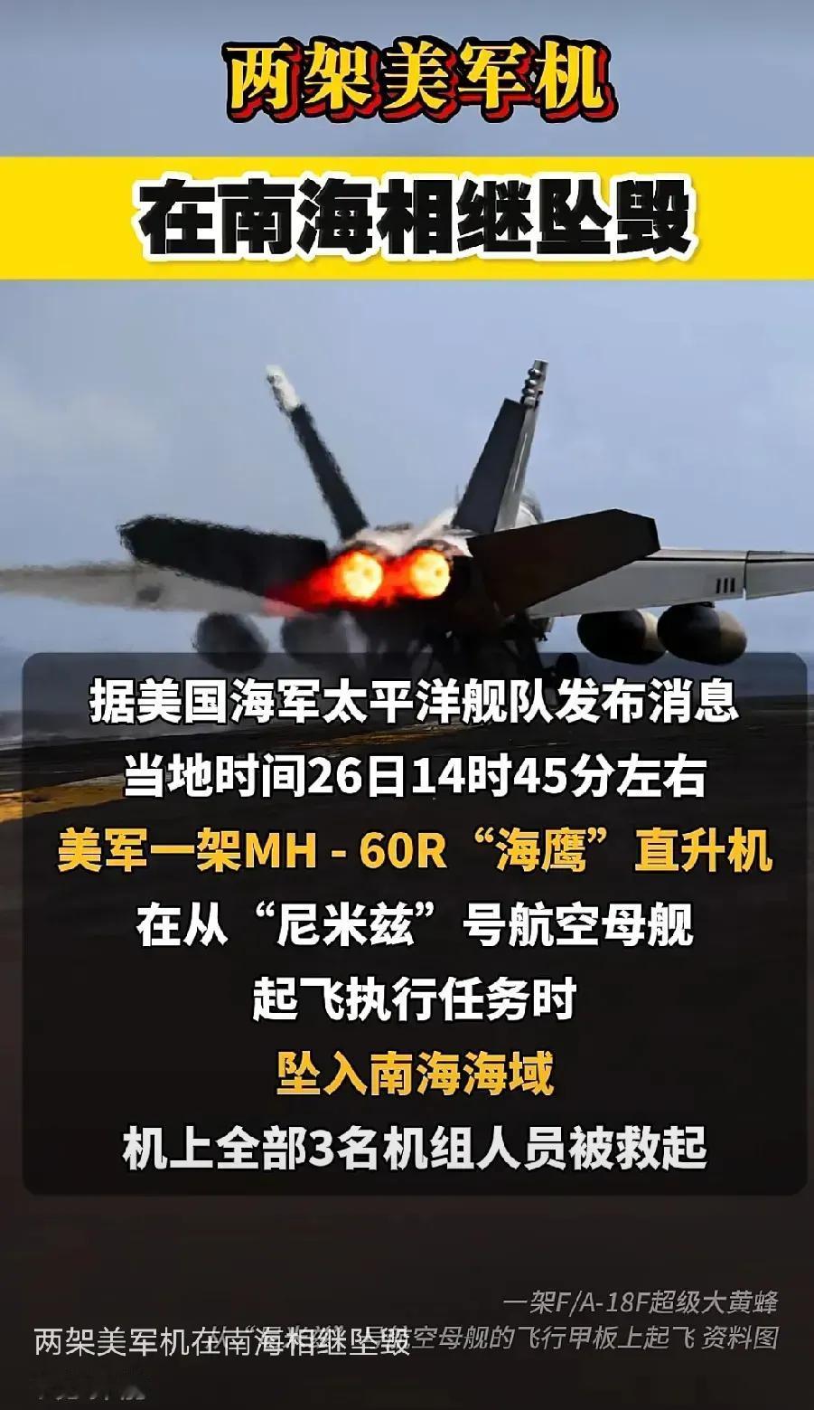 突发消息—— 10月26日,美国海军两架舰载机“海鹰”直升机和“超级大黄蜂”战斗机从“尼米兹”号航母起飞执行任务时,在南海海域相继坠毁,机上人员均被救起 10月27日,美军称两起坠机原因仍在调查中,未透露具体细节。 26日14时45分,美国海军一架隶属于第73直升机海上打击中队的“海鹰”直升机从“尼米兹”号航母起飞后坠海,3名机组人员全部获救。 10月26日15时15分,另一架隶属于第22战斗机攻击中队的“超级大黄蜂”战斗机从同一航母起飞后坠海,2名机组人员弹射逃生并获救。