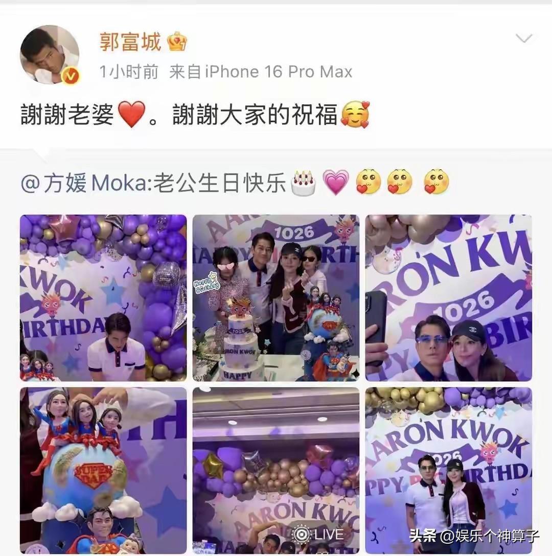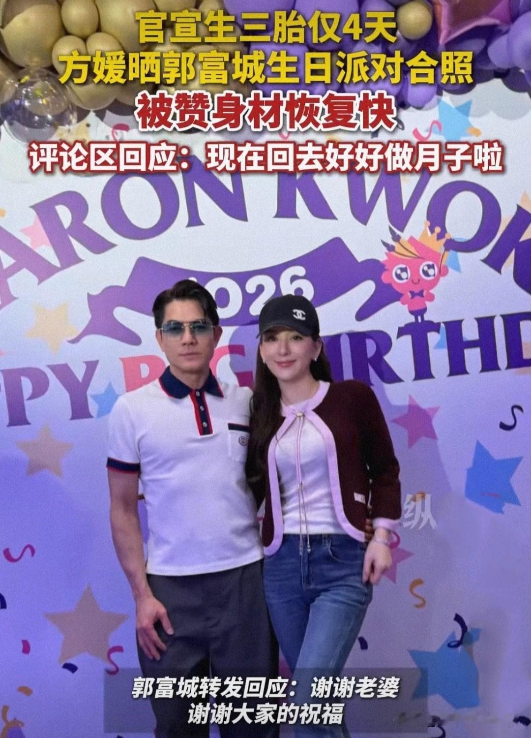 羡慕了!方媛这状态,哪像刚生完三胎呀…… 10月27日,郭富城迎来60岁生日,方媛深夜发文为老公庆生,并晒出一组现场照片。 说实话,看到照片,瞬间惊讶了,方媛身穿牛仔裤,衣服造型有点小香风,才官宣生三胎没几天,我滴乖乖,这状态,这身材,恢复的太快了,有点难以置信,让人羡慕。 按理说,这个时候应该还在坐月子,为了给郭富城庆生,又是准备蛋糕,布置现场,又是拍合照,真是体贴又温柔。 郭富城转发方媛的博文,对老婆表示感谢,也算罕见撒糖了。 这一家人聚在一起,画面好温馨,两个女儿呆萌又可爱,郭富城满脸幸福的笑容,三胎女儿并没有露面,毕竟出生不久。 看得出来,方媛对老公的生日特别重视,不过,一些网友表示,坐月子期间,不好好休息,以后很容易做病。 有一说一,郭富城眼光不错,方媛不仅漂亮,还一点也不矫情,难得呀。
