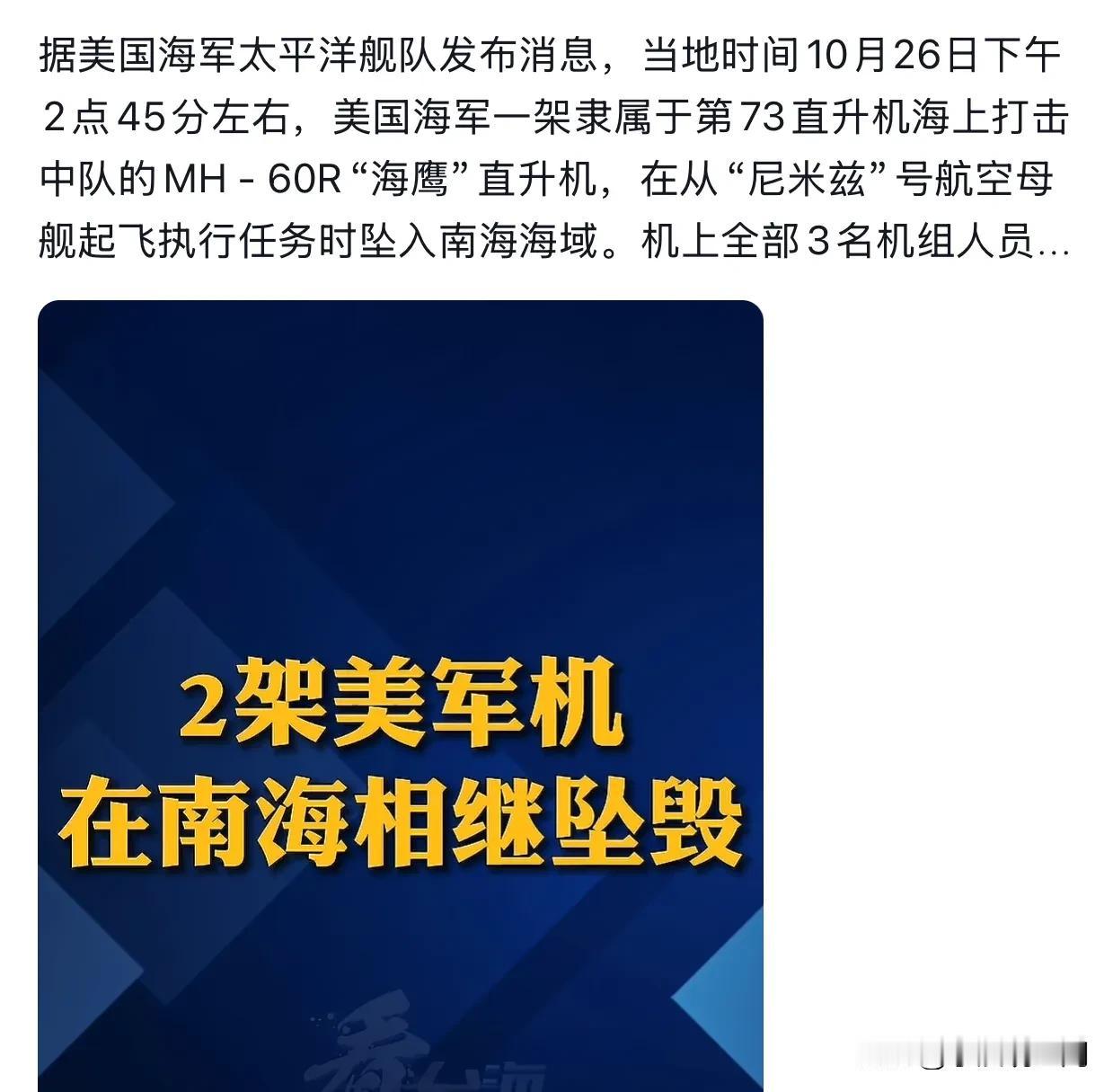 美军两架军机相继在南海坠海,这绝对是个天大的好消息!这也侧面说明了美军现在的军事训练水平差,毫无战斗力!还有就是他们的薪水一直欠发,也影响了士气,送美军两个字“活该”!