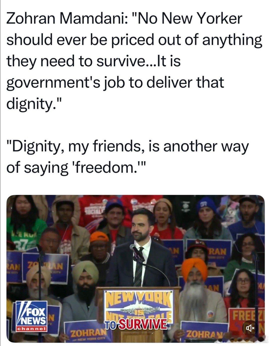 Mamdani的竞选纲领,包括向1%富豪和大公司加税,用来提供免费幼儿园、公交车、食物补贴等等~“活得有尊严,就是自由”