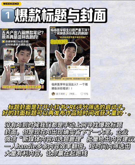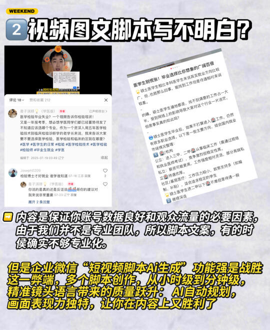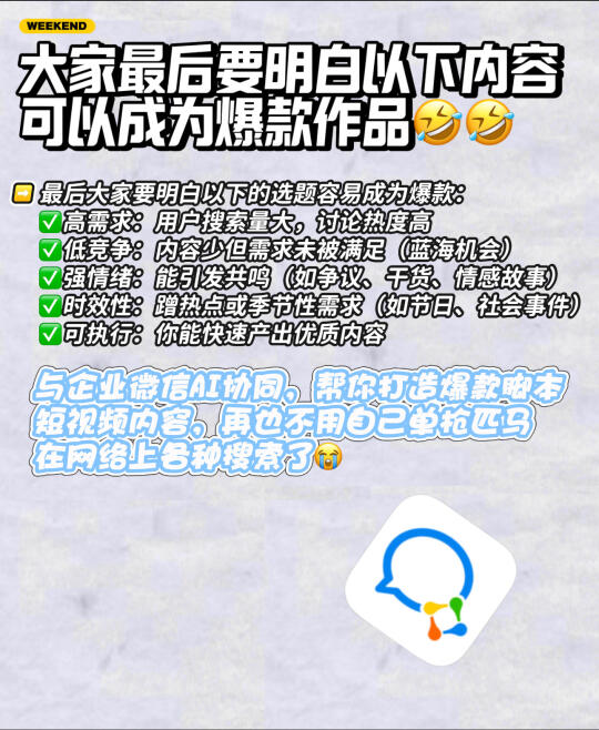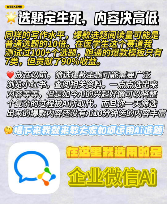 🌟自媒体有句话:选题定生死,内容决高低 同样的写作水平,爆款选题阅读量可能是普通选题的10倍。在医学生这个赛道我测试过100+个选题,跑通的爆款模板只有7类,但贡献了90%收益。 就这个简简单单的选题问题就让我上个月产生了数十篇爆款,当然,如果人工几乎不太可能完成如此准确的选题,那么我是如何做到的? - 今天日期作品教大家如何快速高效率选题? - ❤️放在以前,筛选爆款主题可能需要广泛浏览,查阅相关资料,一点点选出来内容等等,但是如今Ai的兴起好像可以将整个复杂的过程被Ai所取代,而且你一天筛选出来的爆款内容还没有Ai10分钟选出来的内容丰富 - 🤔️接下来我就来教大家如何运用Ai选题 在这里我选用的是:企业微信 1⃣️爆款标题与封面 标题封面是打开CRE评分筛选的启动子,好的封面标题可以再发布作品短时间收获大量的👀。 没有Ai到时候我们都是手动上网寻找爆款标题封面,但是现在Ai出现确实省下了一大笔,企业微信“新媒体内容Ai选题管理”批量给出内容建议,一人handle多条内容效率翻倍,短时间内筛选出大量有利内容,让你赢在起跑线 2⃣️视频图文脚本写不明白? 内容是让你账号数据良好和观众流量的必要因素,由于我们并不是专业团队,所以脚本文案,有的时候确实不够专业化。 但是企业微信“短视频脚本Ai生成”功能强是战胜这一弊端,多个脚本创作,从小时级到分钟级,镜头语言带来的质量跃升: AI自动规划,画面表现力独特,让你在内容上又胜利了 3⃣️关于粉丝up的问题 很多朋友发了一堆作品,但是不涨粉!这里就要提到内容满意度和价值的问题,结合企业微信选题,好好想想,你的作品是否只满足了观众的情绪价值(一时之需,看完了就弃而无味),没有满足干货价值,干货内容会持续地保持你的粉丝满意度,内容满意度,让粉丝明白你的账号是存在利他性! - 大家要明白以下的选题容易成为爆款: ✅高需求:用户搜索量大,讨论热度高 ✅低竞争:内容少但需求未被满足 ✅强情绪:能引发共鸣(如争议、干货、情感故事) ✅时效性:蹭热点或季节性需求(如节日、社会事件) ✅可执行:你能快速产出优质内容 结合企业微信Ai功能,让你爆款内容百出!!