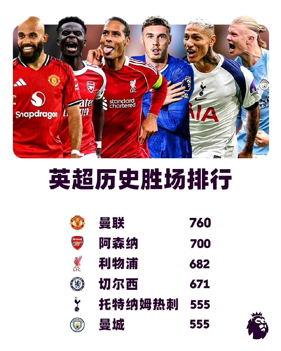 阿森纳也在英超700场胜利了。 仅次于曼联的760场,但是冠军数量比曼联差太多,曼联早就13个英超冠军。 利物浦682场胜利,才2个英超冠军。 曼城555场英超胜利,勉强big6。[笑哭]