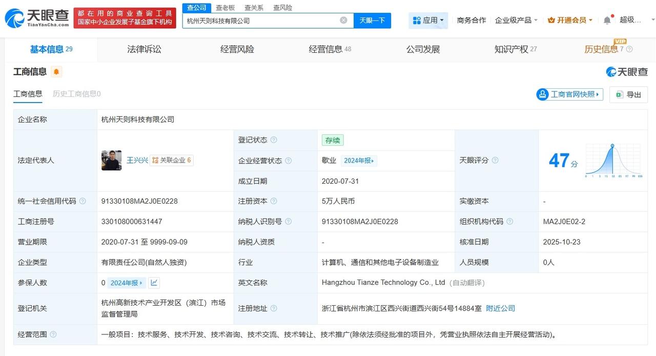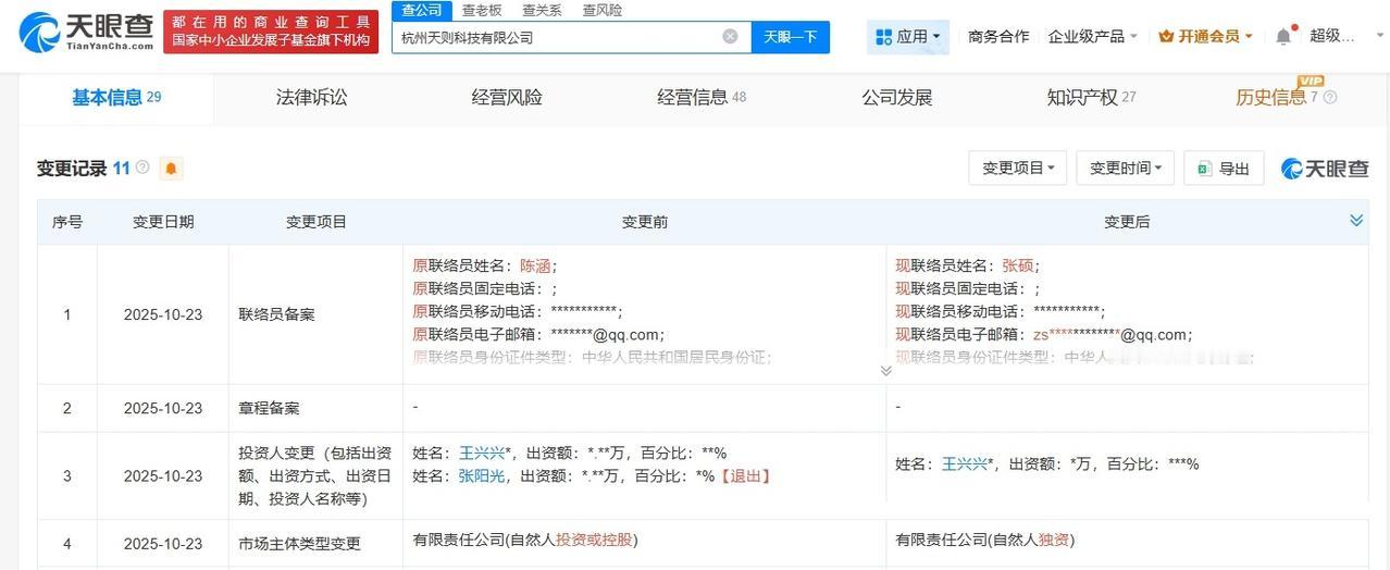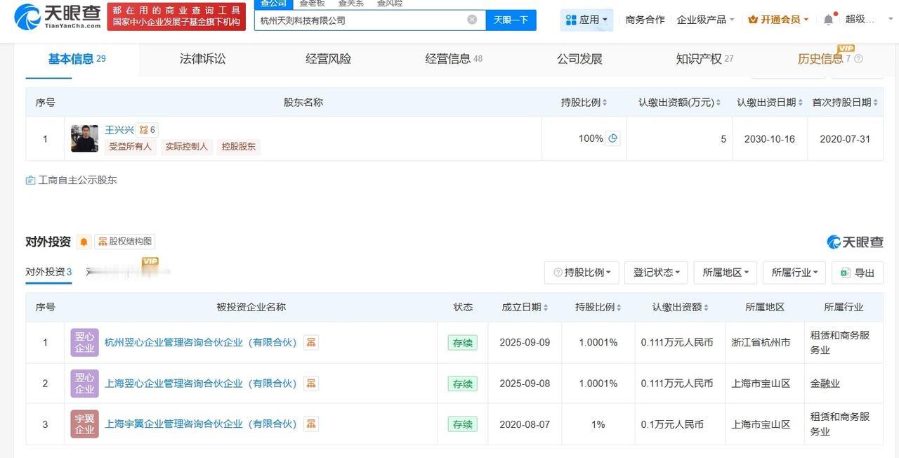 王兴兴全资持股杭州天则科技公司 天眼查App显示,近日,杭州天则科技有限公司发生工商变更,原股东张阳光退出,王兴兴持股比例由99%变更为100%。 该公司成立于2020年7月,法定代表人为王兴兴,注册资本5万人民币,经营范围包括技术服务、技术开发、技术咨询、技术推广等。 天眼查信息: