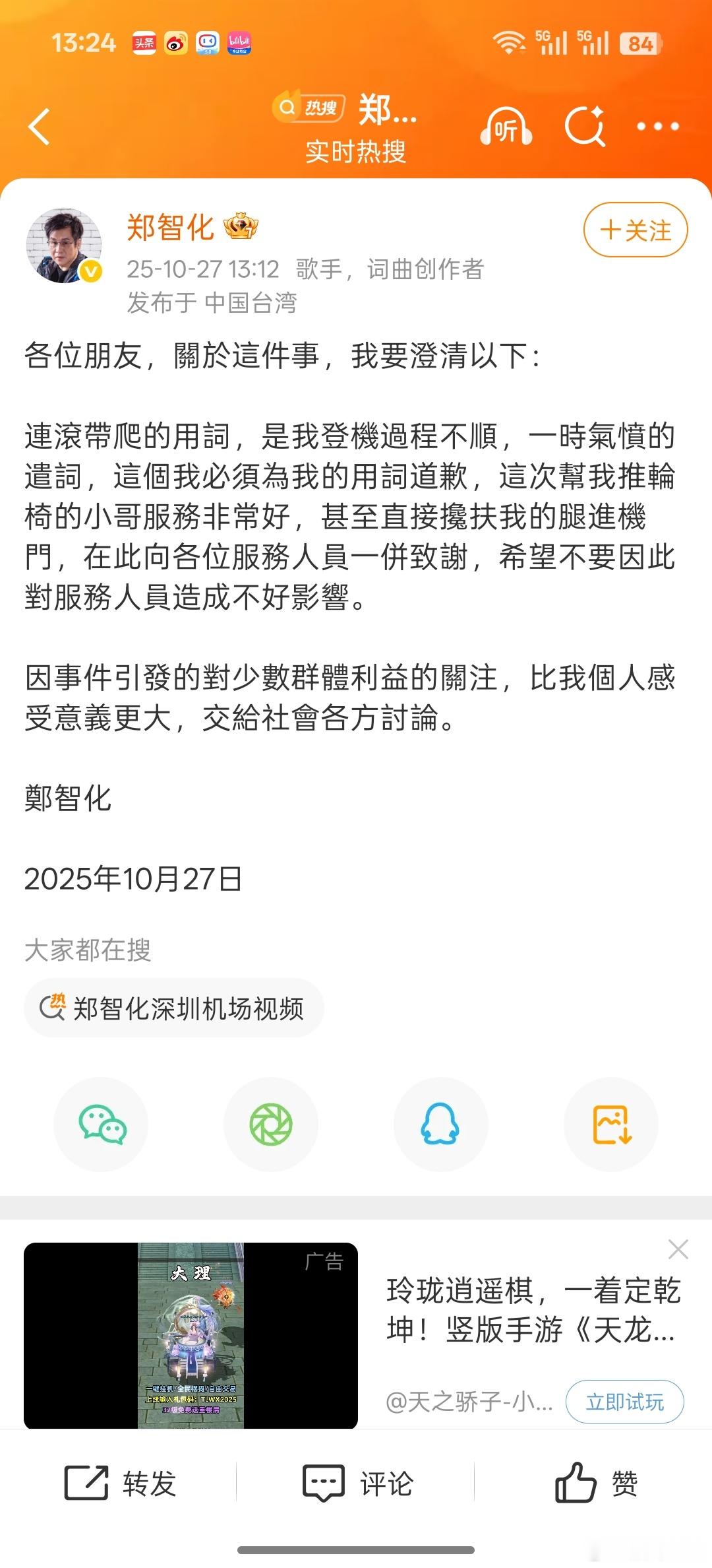 很棒,道歉得很及时,我就说了,郑智化应该及时出来道歉,消除更多的负面影响,还是很听劝的,这样一来大部分人气消了,一些想带节奏蹭流量的人也就没办法继续下去了。