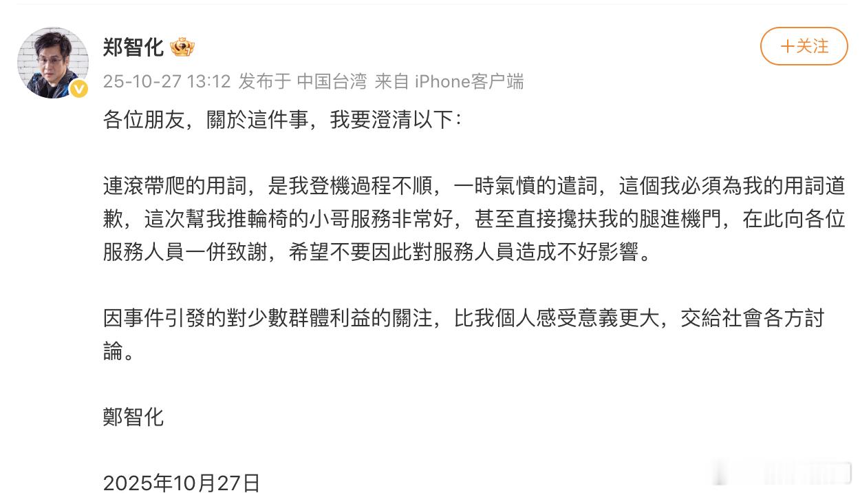 郑智化为连滚带爬用词道歉【郑智化发微博澄清】各位朋友,關於這件事,我要澄清以下:
