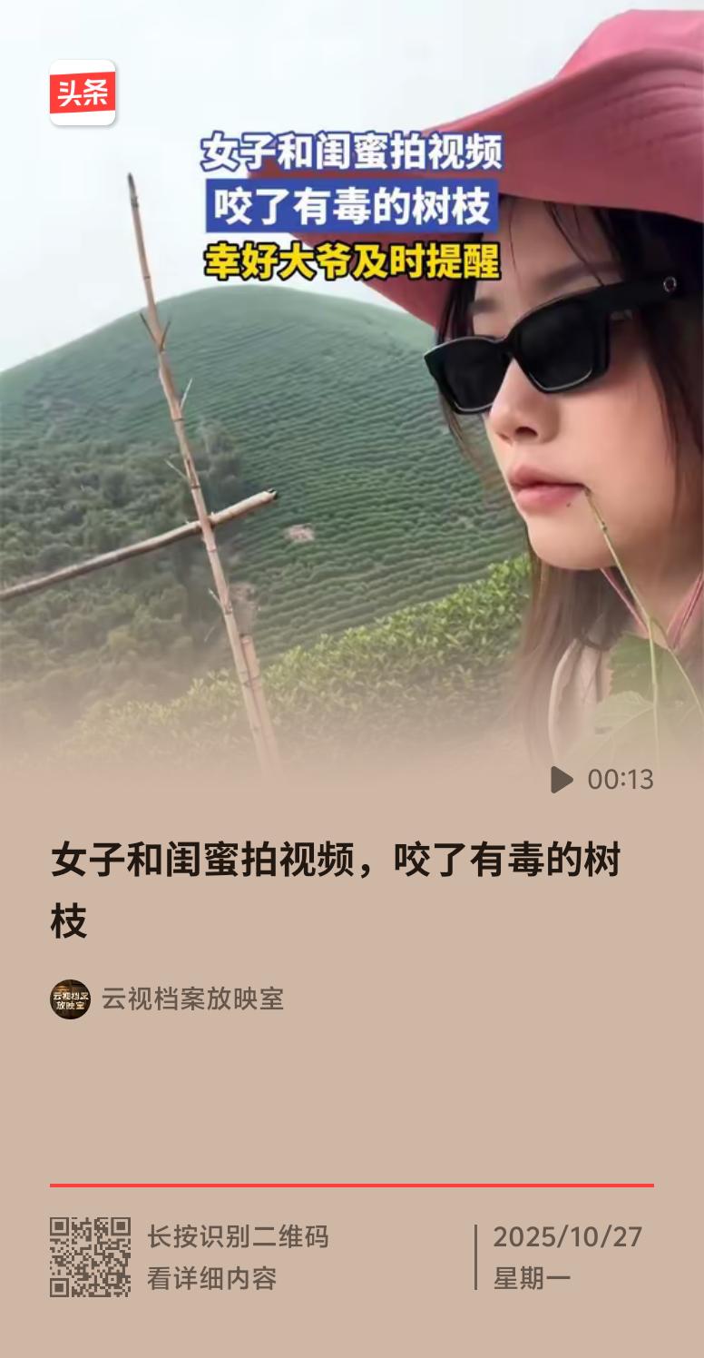 现在有些人为了拍视频、照片真是啥都敢干。就说有女子咬有毒树枝拍视频,还好有大爷提醒,不然指不定出啥事儿。 之前郑州有网友把夹竹桃花含嘴里拍照,第二天直接中毒进医院。夹竹桃这植物,全身上下包括茎、叶、皮、根、花和汁液等都是有毒的。还有浙江绍兴一个小伙,听说夹竹桃叶泡水能下火治牙疼,摘了几片泡水喝,刚喝几口就恶心想吐。 电视剧《甄嬛传》里安陵容都“科普”过夹竹桃有毒。大家拍照追求氛围感没错,但可别拿自己健康开玩笑,像夹竹桃、郁金香、曼陀罗这些,看看就行,可别乱碰乱吃。 草夹竹桃