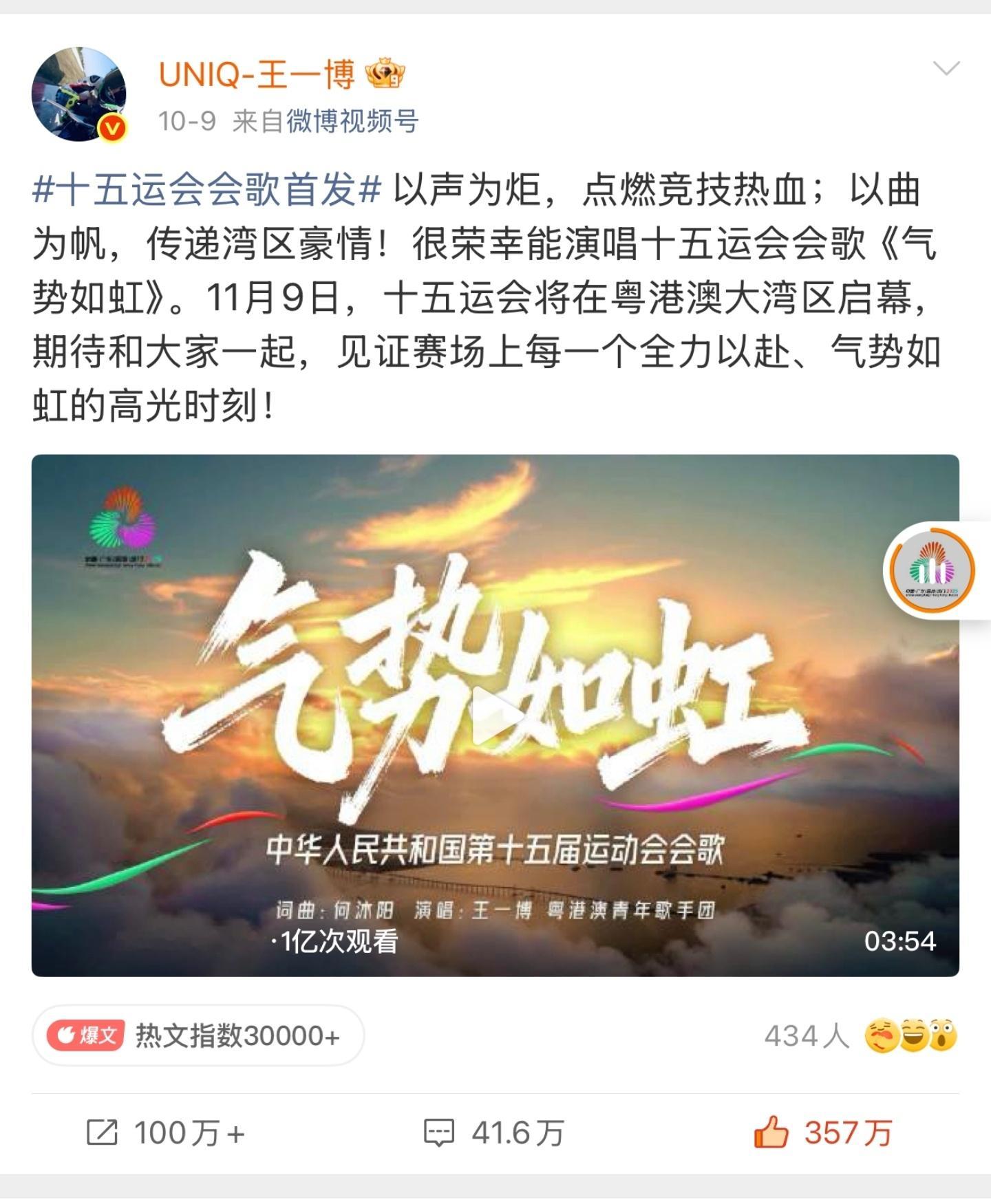 跟随王一博的歌声一起为运动健儿加油王一博气势如虹播放量破亿