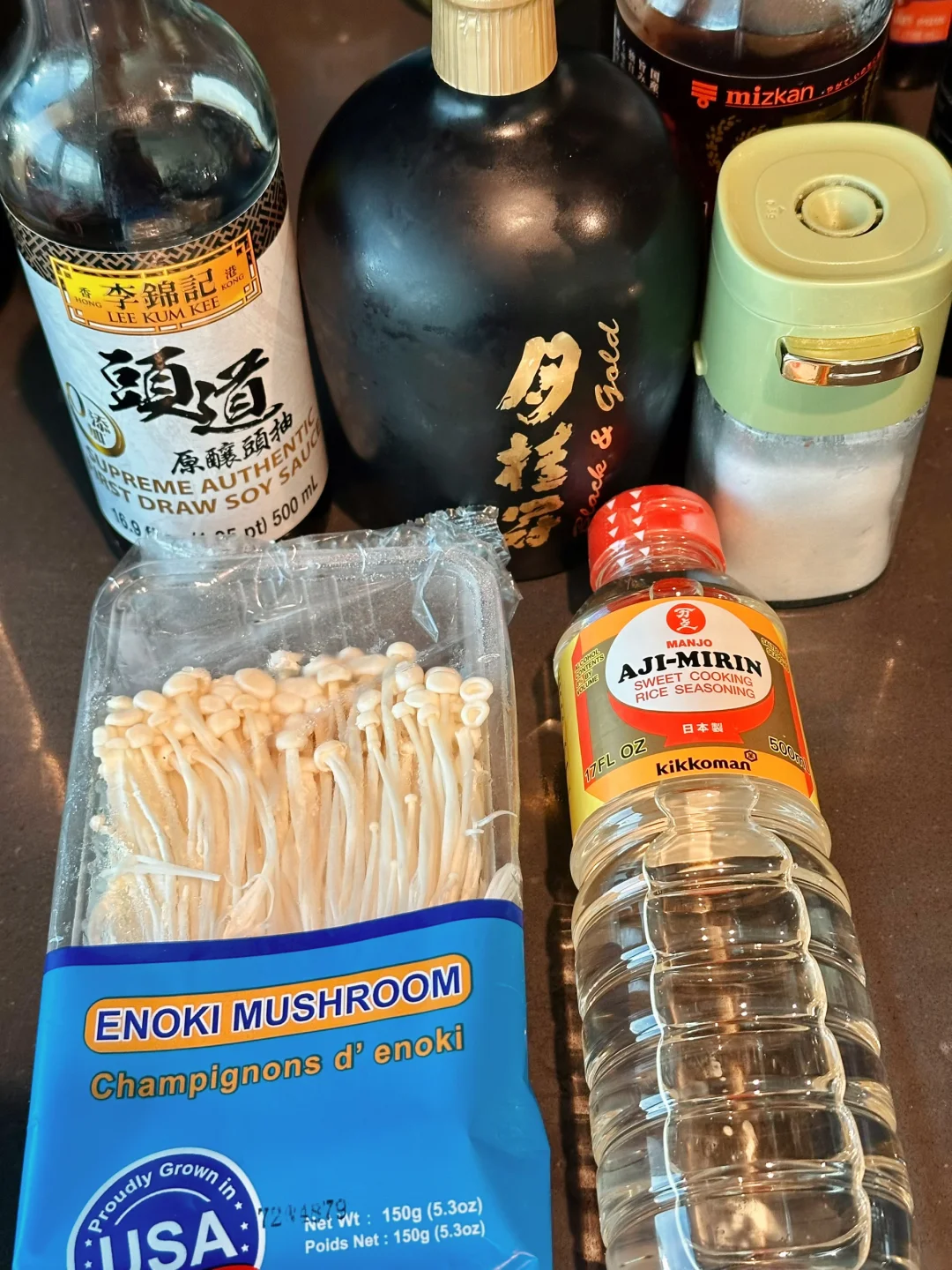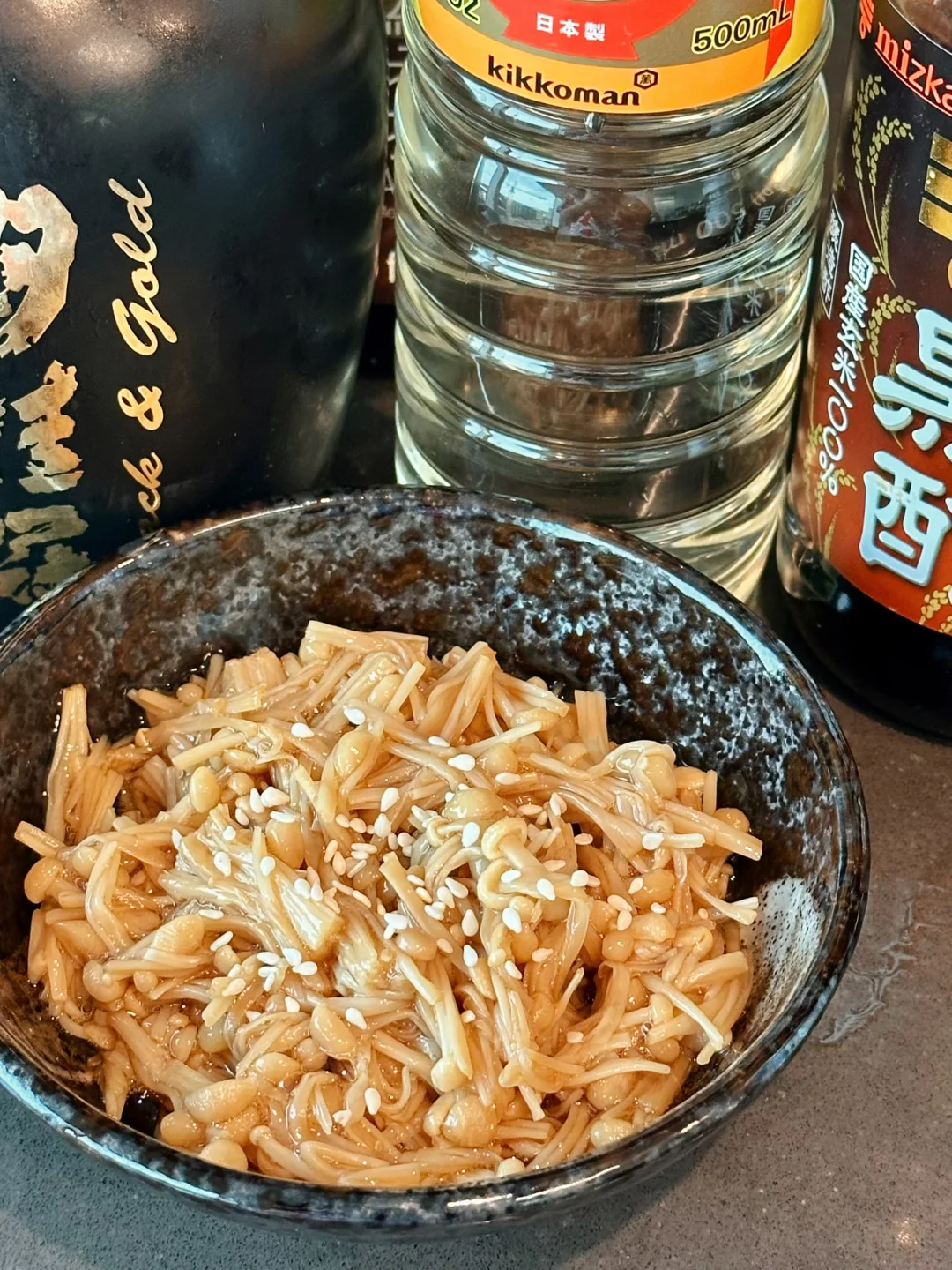 金针菇一盒,生抽2tbsp,清酒1tbsp,味淋1tbsp,白糖2tsp,白芝麻适量。
