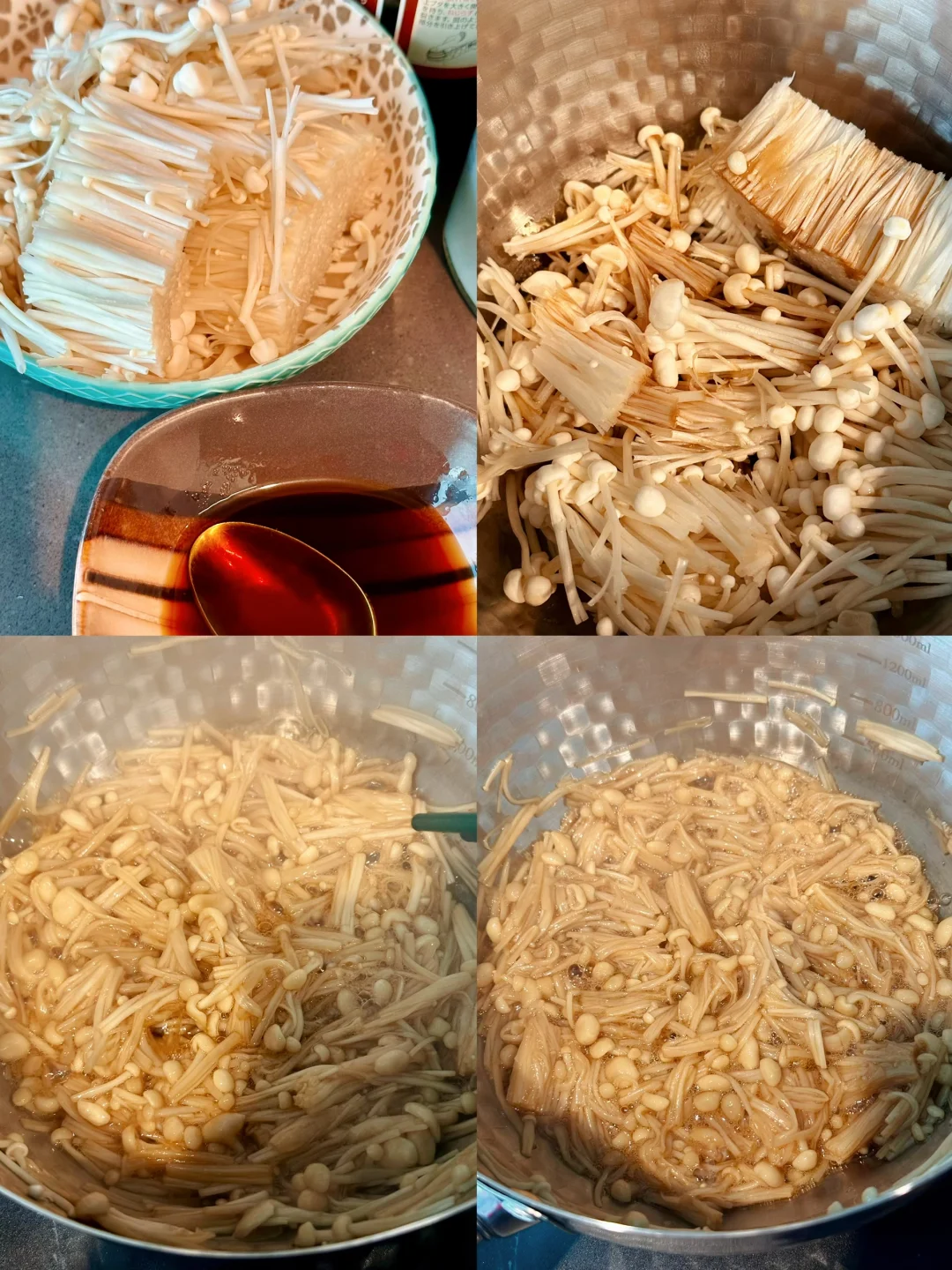金针菇和酱汁一起倒入小锅里中小火煮,一开始干干的,不用担心、因为金针菇会自己析出水分;