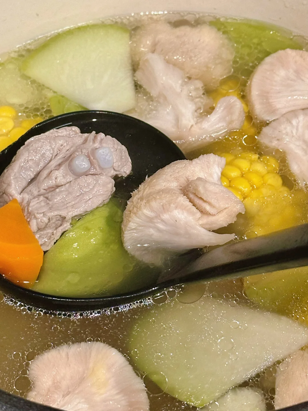 缺德舅这次的很给面子,非常优秀(拉踩一下猴父子有时候反而品质一般般)。没什么苦味,释放淡淡的清香和鲜味,而且很有肉感又吸饱了汤汁,咬下口感非常棒。还搭配了佛手瓜,胡萝卜和玉米,增加一点自然的甜味,在这个降温的秋天吃就很润很舒服。