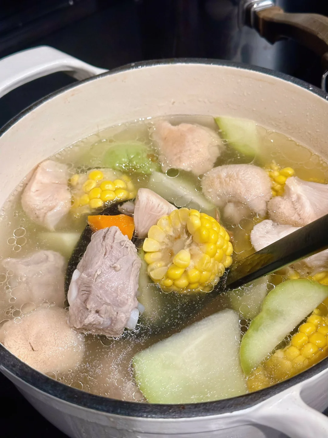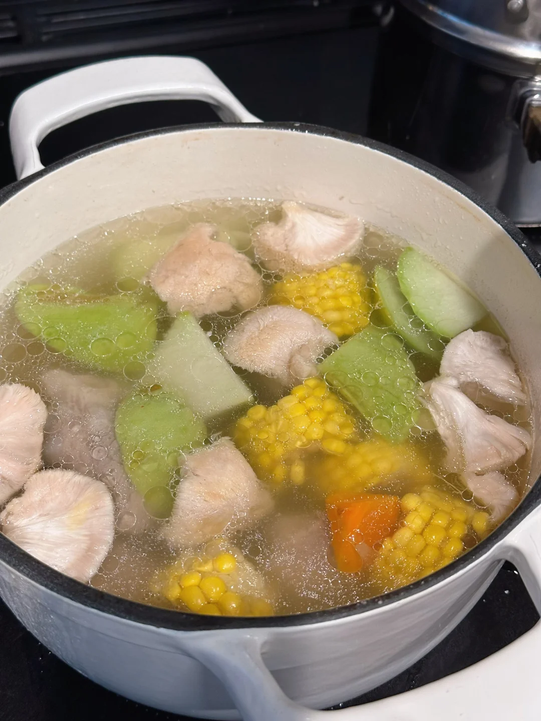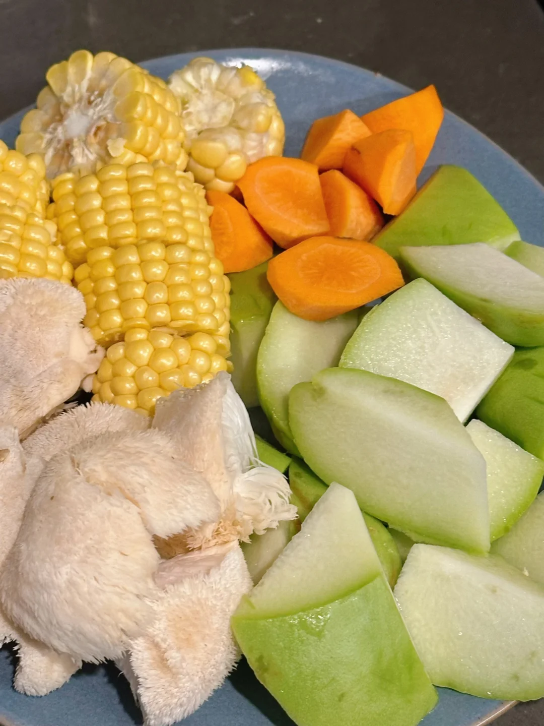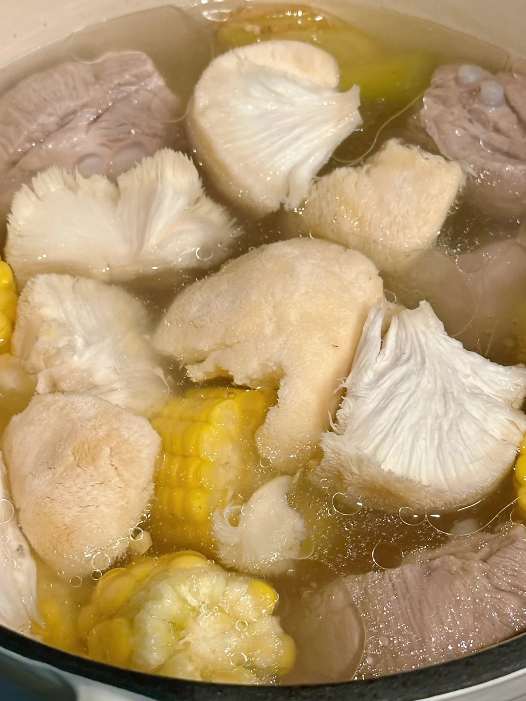 加入胡萝卜,玉米,猴头菇炖半小时,然后再放入佛手瓜炖十分钟,最后加盐调味,就完成啦!