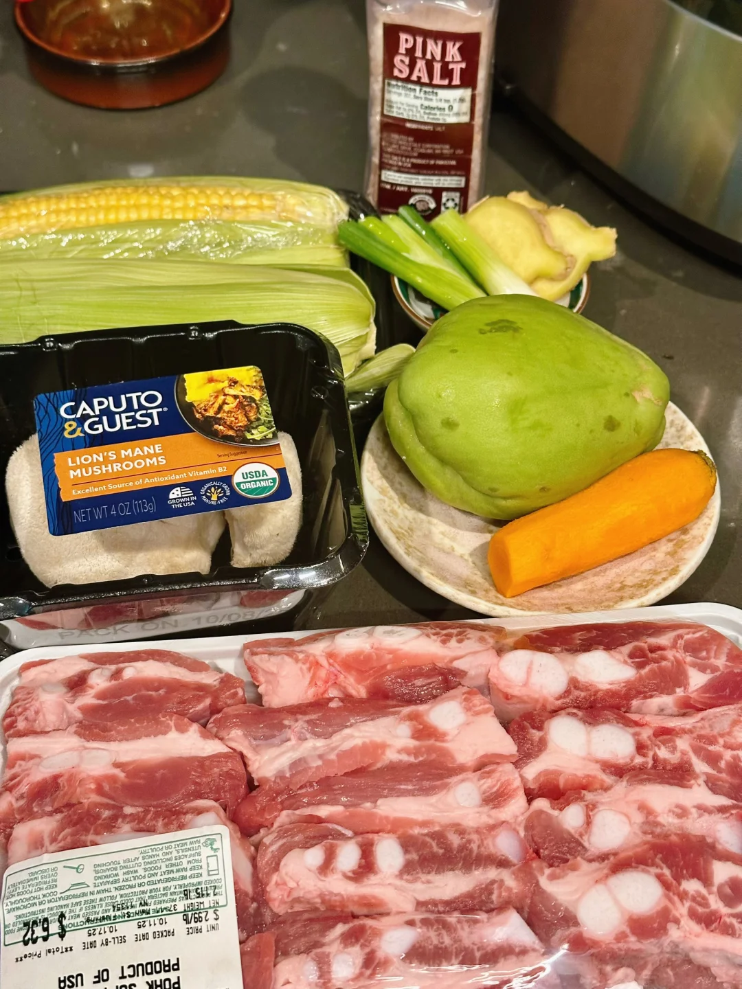 猴头菇一盒(Lion's Mane Mushroom),猪小排一磅,甜玉米一根,胡萝卜一根,佛手瓜一个(chayote,超市还挺常见因为拉美人也爱吃),葱一根,姜两片,料酒适量。