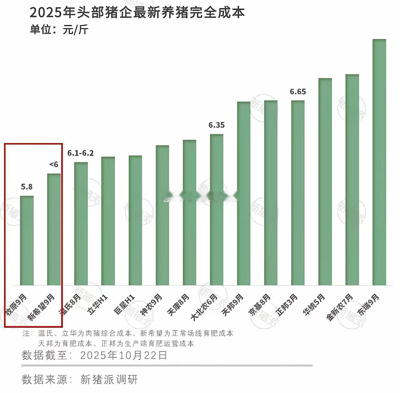 牧原成本最低,已经降到了5.8元/斤,新希望也是低于6元/斤,温氏在6.1-6.2元/斤,这三家是相对成本最低的猪企。