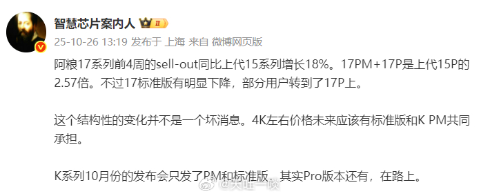 4、小米17系列销量结构发生变化,这对于小米来讲是好消息并不是坏消息。未来4000档是由小米数字系列标准版以及REDMI K Pro Max来共同支撑。