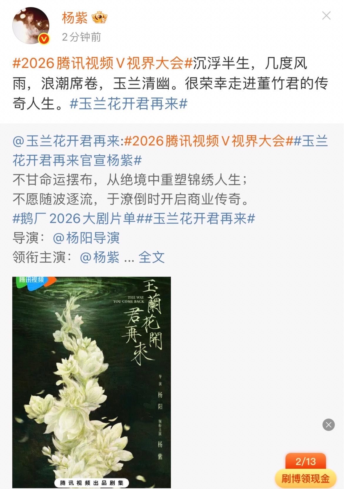 杨紫[超话]杨紫事业脑杨紫玉兰花开君再来无缝进组 我勒个真无缝进组啊!生命树还
