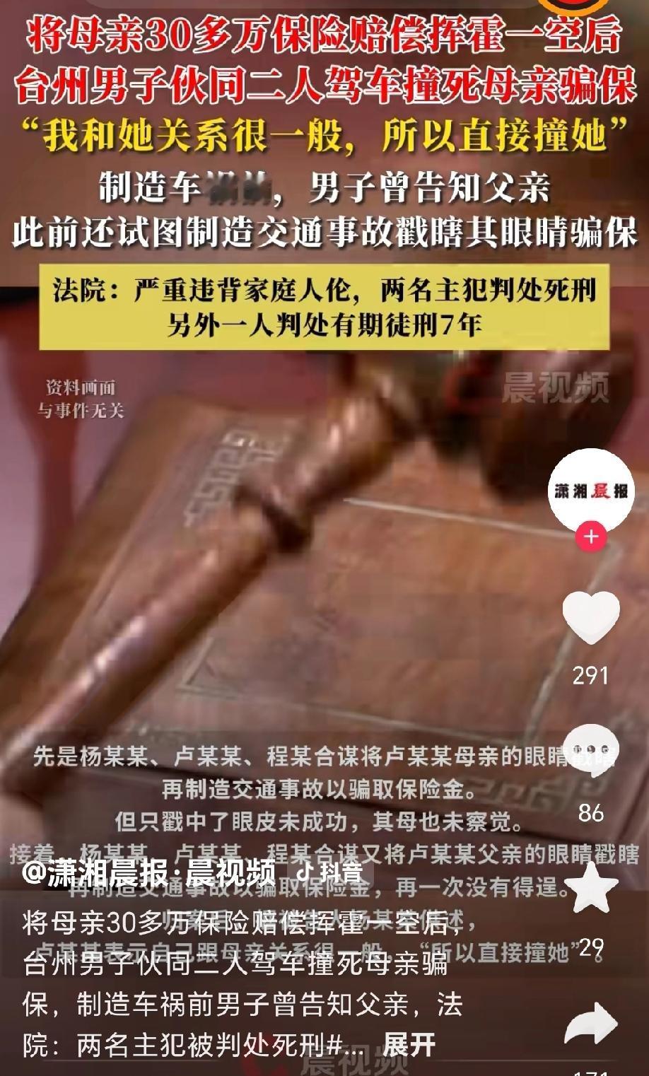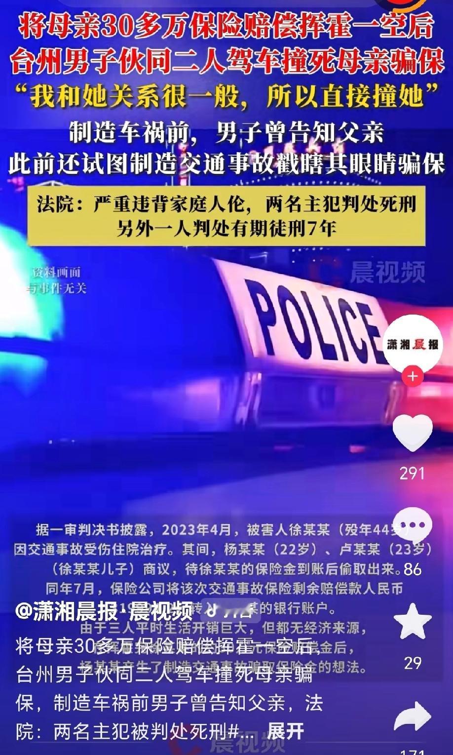 浙江台州,23岁男子没有经济收入,整天还挥霍无度,一次母亲因意外交通事故住院,获赔32万保险理赔金,大多数都让男子挥霍殆尽。男子不仅不心疼母亲,还反而发现了“商机”,于是联合两个朋友,故意制造交通事故,还试图戳瞎母亲骗取高额保险金,失败后又故意撞死母亲骗保,结果让男子和朋友意想不到。 23岁的卢某为了骗取保险金,竟然联合两个狐朋狗友,对生养自己的母亲痛下杀手,这般冷血行径,实在让人难以接受。 卢某打小就没养成正经模样,成年后更是好吃懒做,没有一份稳定工作,却整天想着挥霍享乐,花钱如流水。 2023年4月,他的母亲徐某遭遇意外交通事故,住进了医院,幸运的是,保险公司最终赔付了319994.2元的保险金。 这笔钱本是徐某后续治疗和生活的保障,可在卢某眼里,却成了送上门的零花钱。 看着账户里的三十多万,卢某馋得不行,压根没想着母亲还在病床上遭罪。 他偷偷摸摸拿出母亲的身份证和银行卡,还拉上了同样游手好闲的好友杨某,两人一合计,就把母亲的救命钱给动了。 杨某拿着证件到银行柜台取现2万,卢某则悄悄操作母亲的支付宝,转走3万后转到杨某账户,第二天杨某又取现26.23万。 短短几天,三十多万就被两人挥霍一空,吃喝玩乐、请客送礼,花得那叫一个痛快,完全没考虑过母亲后续的生活。 钱很快花光了,可三人的开销一点没减,没了经济来源的他们,又开始动起了歪心思。 杨某脑子一转,提议干脆制造交通事故骗保,卢某和另一个朋友程某一听,当场就同意了,三人一拍即合,把目标再次对准了卢某的母亲徐某。 他们先是合计着把徐某的眼睛戳瞎,再制造交通事故,这样理赔金额能更高。 2023年9月的一个晚上,卢某找了个借口,骑着电动车载着母亲出门,程某开车,杨某坐在副驾驶,在一座立交桥下故意撞倒了电动车。 趁着混乱,卢某掏出事先准备好的钉子,朝着母亲的眼睛戳去,可慌乱中只戳中了眼皮,徐某并没察觉儿子的歹毒,这事也就不了了之。 第一次没成功,三人非但没收手,反而更疯狂了,又把主意打到了卢某父亲身上,想故技重施戳瞎父亲的眼睛,结果还是没能得逞。 两次失败让他们变得越发丧心病狂,杨某干脆提议,直接开车撞死卢某他母亲,这样保险金拿得更利索! 让人没想到的是,卢某竟然毫无犹豫地答应了,还轻飘飘地说自己和母亲关系很一般,下手没负担。 为了确保万无一失,三人提前踩点,选中了某村边一条没有监控的村路作为作案地点。 案发前,他们还上网查了撞死人大致需要的车速、可能拿到的赔偿金额,甚至约定好了理赔后的分成比例,连事后怎么逃避侦查都盘算好了。 2023年9月30日晚,卢某骗母亲徐某从暂住处出来,把她带到约定地点,让母亲站在路南侧,自己则借口站到了路北侧。 随后,杨某驾车朝着徐某猛冲过去,巨大的冲击力把她撞飞到路边的田地里,徐某伤势过重,经送医抢救无效,当天就不幸离世了。 看着母亲倒在地上一动不动,三人没有丝毫慌乱,还以交通事故为由报了警。 纸终究包不住火,2023年10月,警方经过缜密侦查,将杨某、卢某、程某三人抓获归案。 面对审讯,他们对自己的罪行供认不讳。 《刑法》第二百六十四条规定,盗窃公私财物,数额较大的,或者多次盗窃、入户盗窃、携带凶器盗窃、扒窃的,处三年以下有期徒刑、拘役或者管制,并处或者单处罚金;数额巨大或者有其他严重情节的,处三年以上十年以下有期徒刑,并处罚金…… 卢某在未经母亲同意的情况下,偷出母亲的身份证和银行卡,拉上杨某一起将这笔钱取出并挥霍。 其中,杨某持徐某的身份证和银行卡在柜台取现2万元,卢某擅自操作徐某的支付宝转走3万元,杨某次日又取现26.23万元。 以上取现行为符合盗窃罪的构成要件,属于秘密窃取他人财物,且数额巨大。 《刑法》第二百三十二条规定,故意杀人的,处死刑、无期徒刑或者十年以上有期徒刑;情节较轻的,处三年以上十年以下有期徒刑。 更令人可恨的是,卢某、杨某和程某为了骗取保险金,多次策划并实施针对卢某母亲徐某的伤害行为。 他们先是试图戳瞎徐某的眼睛以提高保险理赔金额,在第一次尝试失败后,又将主意打到卢某父亲身上,再次失败后,三人更是丧心病狂地决定驾车撞死徐某。 他们提前踩点,确定作案地点,还上网查询相关信息,约定分成比例和逃避侦查的方法,主观上具有明显的故意杀人故意,客观上实施了驾车撞击徐某并导致其死亡的行为,构成故意杀人罪。 最终,台州市中院一审判决:杨某、卢某均犯故意杀人罪、盗窃罪,数罪并罚,决定执行死刑,剥夺政治权利终身,并处罚金8万元;程某犯故意杀人罪,判处有期徒刑7年。 本该是母子情深,卢某却为了钱财弑母,这般冷血无情的行为,不仅毁掉了自己的人生,也让一个家庭彻底破碎。