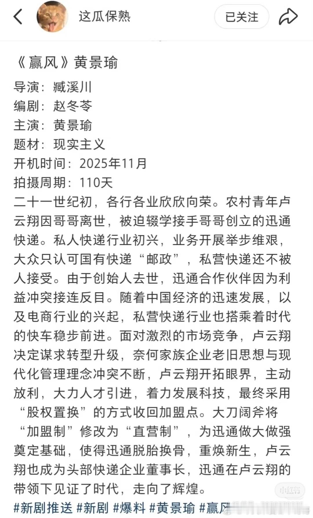 赢风官宣黄景瑜 由编剧赵冬苓,导演臧溪川联袂打造的电视剧《赢风》官宣领衔主演黄景瑜,讲述中国快递先锋发展史,演绎一代人的坚守、选择与成长,预计下月开机。期待卢云翔!
