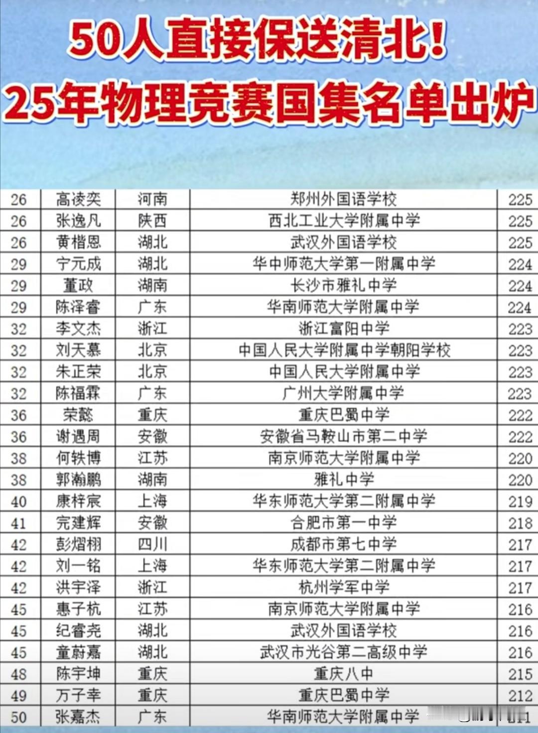 2025年第42届全国物理竞赛国家集训队名单已揭晓。 第42届物理竞赛国家集训队成员共计50人。 其中,湖南省有3人入选,且这3人均来自长沙四大名校,雅礼中学占2人,湖南师范大学附属中学有1人。 广东省共有5人入选,华南师范大学附属中学有3人,深圳外国语学校和广州大学附属中学各有1人。