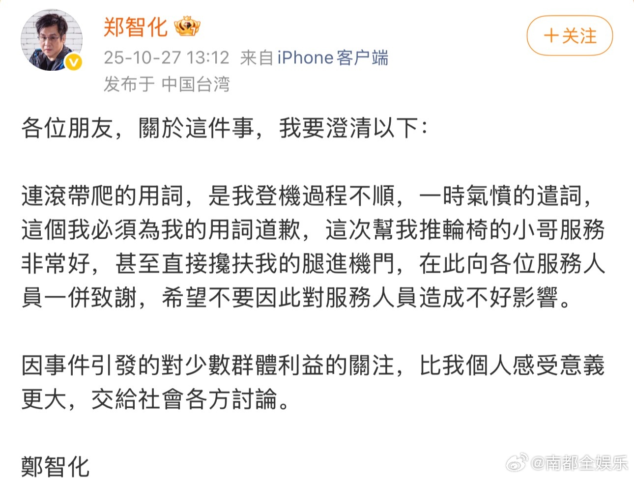 郑智化致歉郑智化回应连滚带爬用词不当27日,再次发文回应深圳机场事件,并就自己用词不当致歉,“连滚带爬的用词,是我登机过程不顺,一时气愤的遣词,这个我必须为我的用词道歉,这次帮我推轮椅的小哥服务非常好,甚至直接搀扶我的腿进机门,在此向各位服务人员一并致谢,希望不要因此对服务人员造成不好影响。因事件引发的对少数群体利益的关注,比我个人感受意义更大,交给社会各方讨论。”
