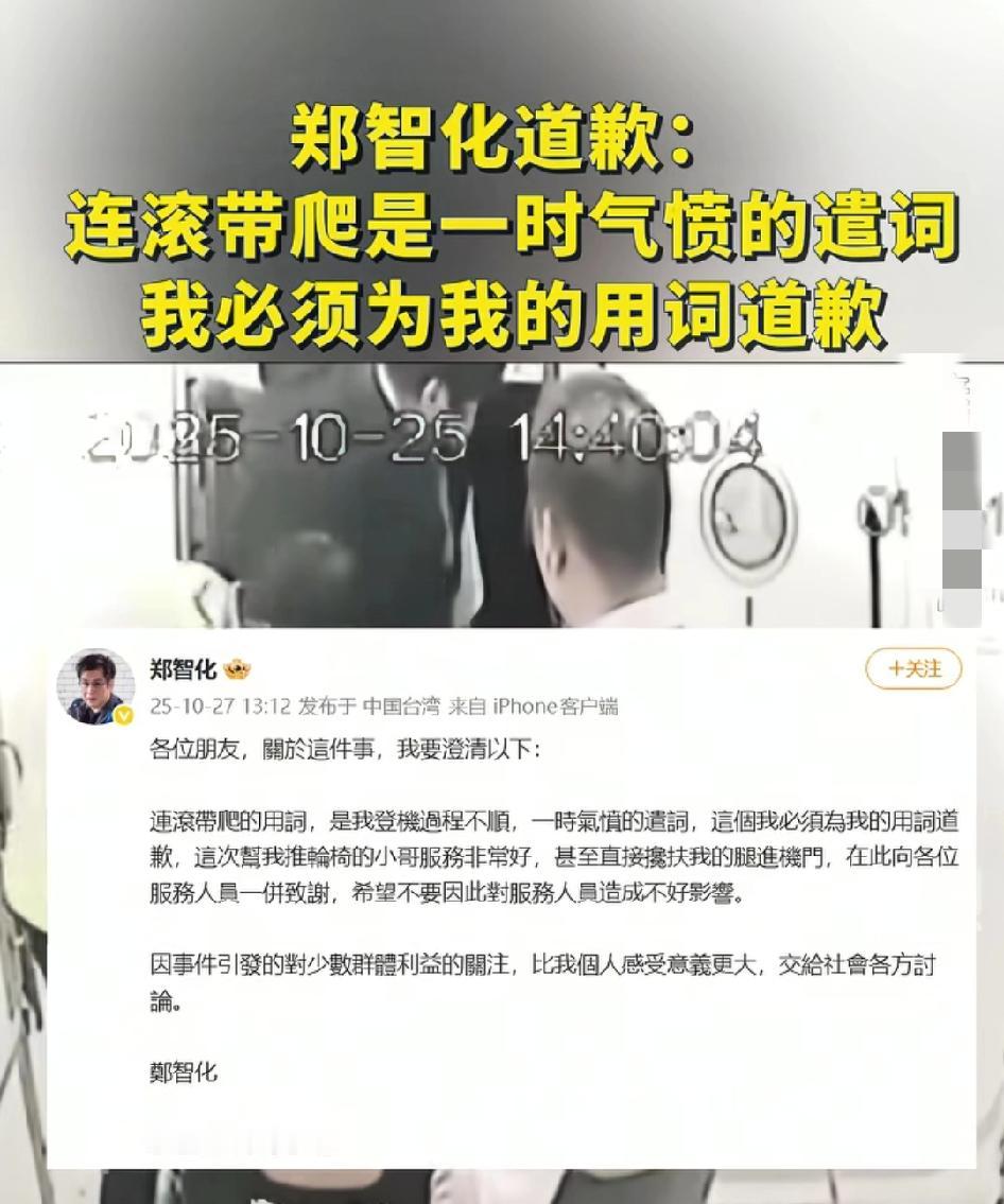 机场风波事件最新后续来了, 郑智化郑重向服务人员道歉。“连滚带爬”是自己用词不当,是一时气愤才说的。 当时10月25号看到他用这个词真的以为他是摔倒了啥的,机场也真的没有人扶他。 看了机场监控还原的真相,才明白他用词真的是把夸张用的炉火纯青,如果没有监控可能机场的工作人员会被网暴,也许还会丢掉工作。 但他的初衷是好的,是希望能有更好的服务设施,来让残疾人得到更好的人性化服务。 作为演艺人员更应当以身作则,遇事要冷静,理性的维权才会赢得尊重!