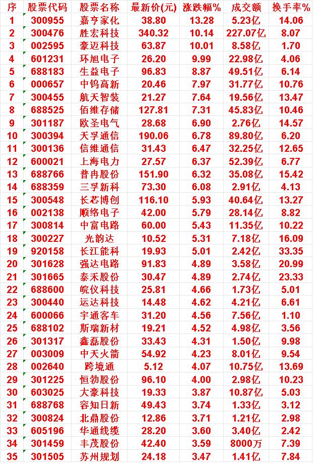 10月27日,MACD日线金叉的35名单汇总 嘉亨家化:最新价38.80元,上涨13.28% 胜宏科技:最新价340.32元,上涨10.14% 豪迈科技:最新价63.87元,上涨10.01% 环旭电子:最新价26.20元,上涨9.99% 生益电子:最新价96.83元,上涨8.87% 中钨高新:最新价20.46元,上涨7.97% 航天智装:最新价21.27元,上涨7.64% 佰维存储:最新价127.81元,上涨7.31%