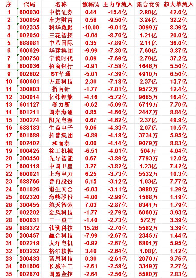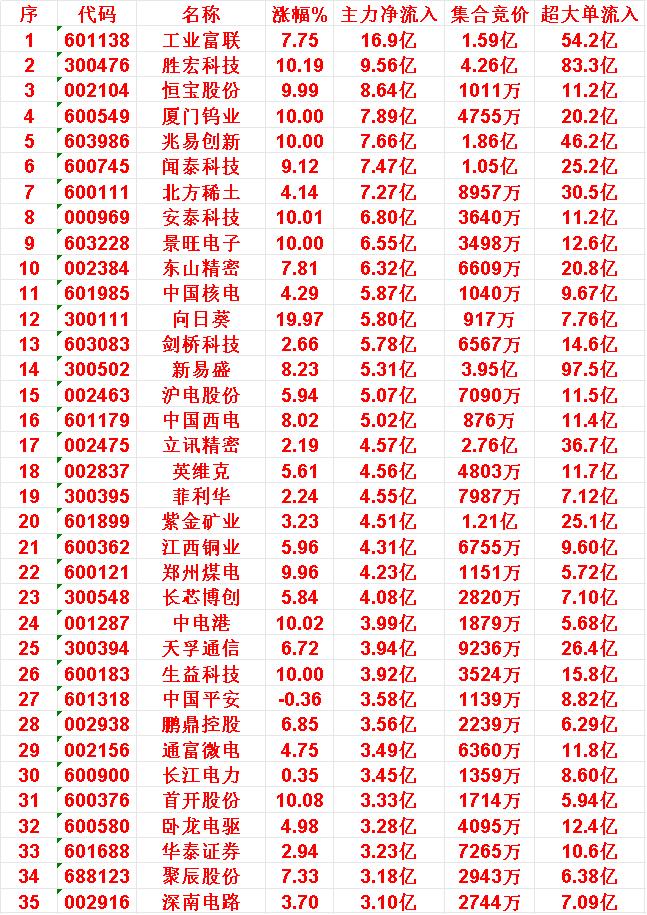 10月27日收盘,主力趁冲高,已经大幅卖出的35名单: 中信证券:净流出15.4亿元 东方财富:净流出9.50亿元 科华数据:净流出9.01亿元 三花智控:净流出8.76亿元 中芯国际:净流出7.89亿元 华建集团:净流出7.80亿元 宁德时代:净流出7.69亿元 招商银行:净流出7.58亿元 ST华通:净流出7.39亿元 方正科技:净流出7.18亿元 指南针:净流出7.01亿元 亿纬锂能:净流出5.72亿元 赛力斯:净流出5.09亿元 国泰海通:净流出4.66亿元 10月27日收盘,主力资金“大幅买入”的35强: 以下是主力净流入与超大单流入排名前7的个股情况(单位:亿元人民币): 工业富联:净流入16.9亿元,超大单流入54.2亿元 胜宏科技:净流入9.56亿元,超大单流入83.3亿元 恒宝股份:净流入8.64亿元,超大单流入11.2亿元 厦门钨业:净流入7.89亿元,超大单流入20.2亿元 兆易创新:净流入7.66亿元,超大单流入46.2亿元 闻泰科技:净流入7.47亿元,超大单流入25.2亿元 北方稀土:净流入7.27亿元,超大单流入30.5亿元