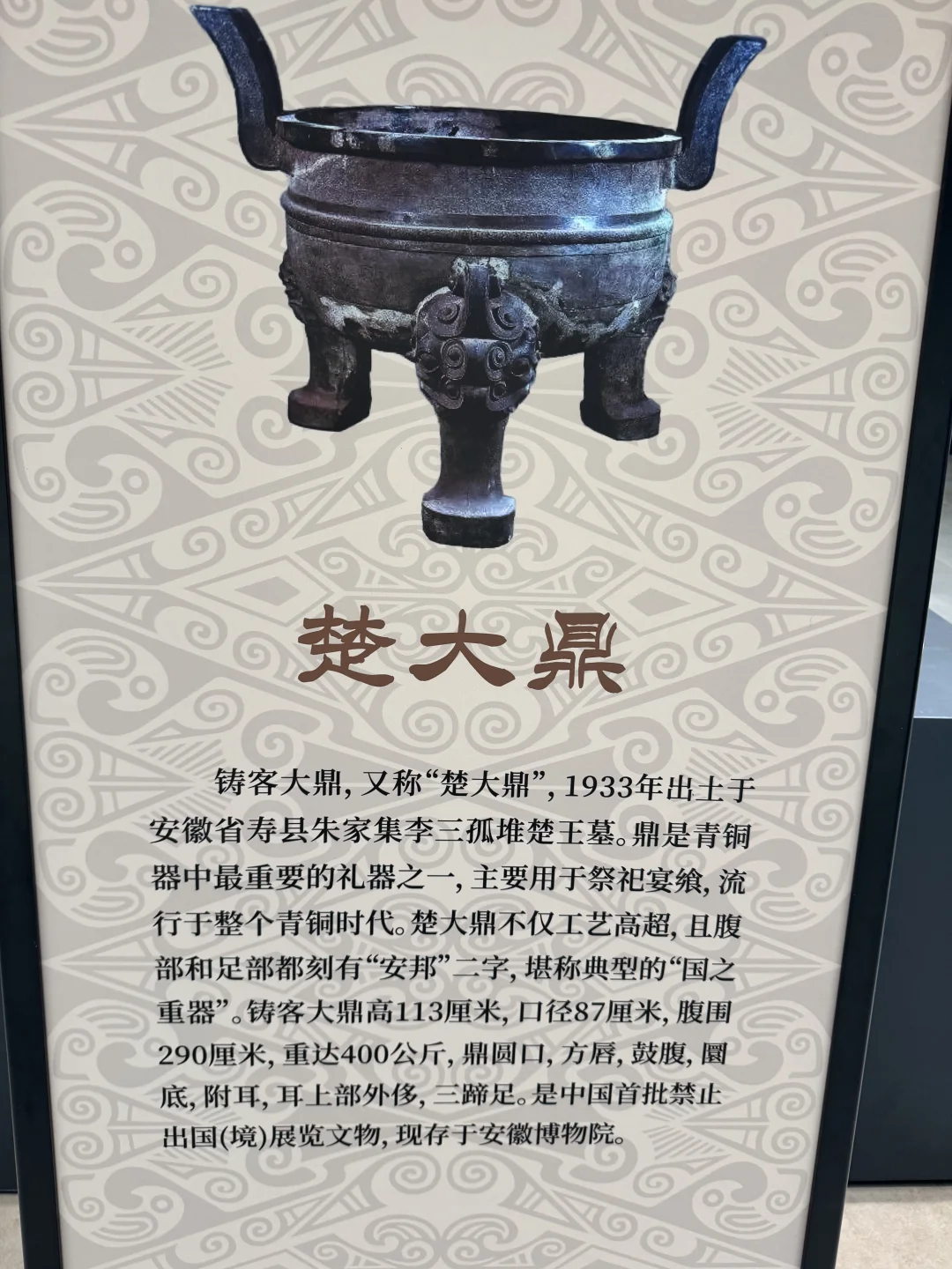 图片拍摄于上海闵行博物馆楚风烈特别展出 毛主席说过可以煮一头牛的鼎是铸客铜鼎,又称“楚大鼎”。 铸客铜鼎于1933年出土于安徽寿县朱家集李三孤堆楚王墓,现藏于安徽博物院。该鼎通高113厘米,口径87厘米,重约400公斤,是迄今为止发现的春秋战国时期最大最重的青铜圆鼎。1958年,毛泽东参观安徽省博物馆时,曾绕着此鼎转了大半圈,感叹道:“好大一口鼎,能煮下一头牛呵!”。