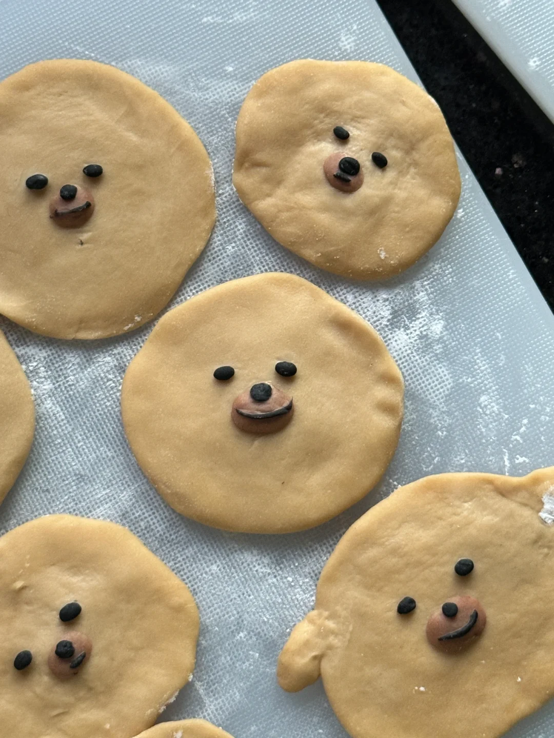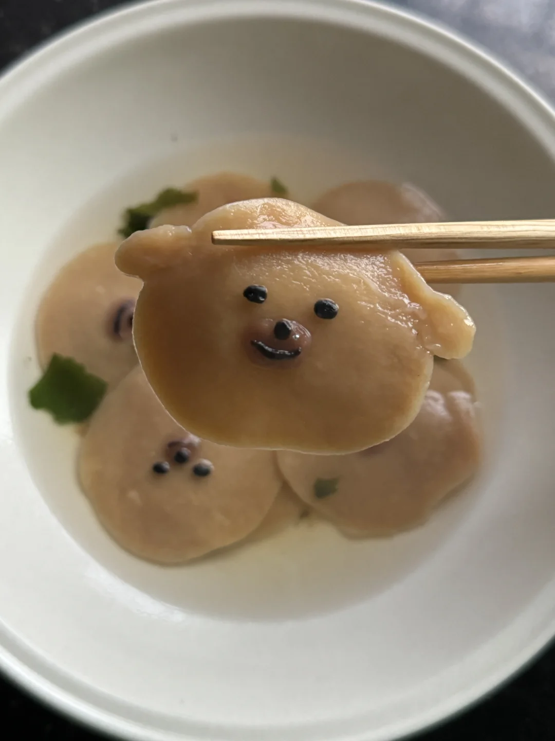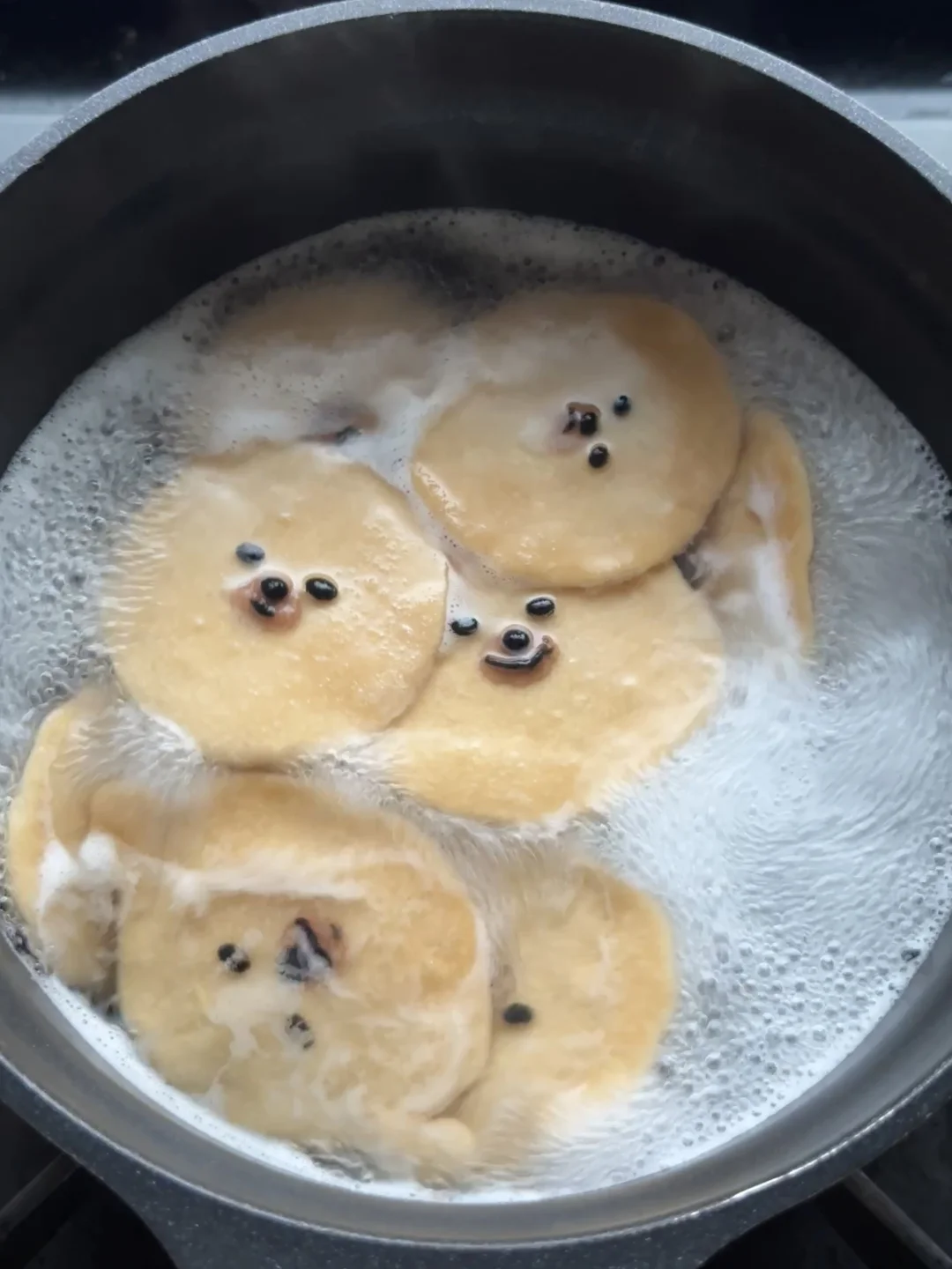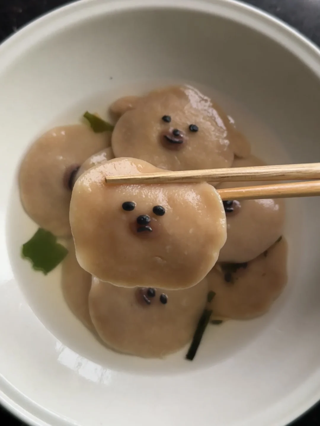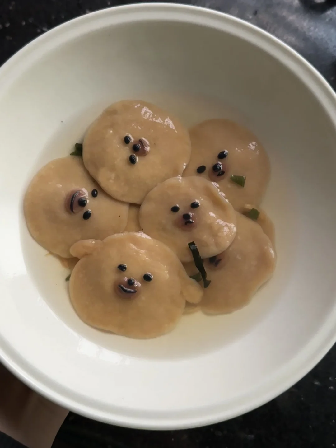 是班味满满的蘸酱狗 生活不易 总得找点乐趣 - 材料:中筋面粉100g、清水50g、盐1g、老抽适量、可可粉、竹炭粉 步骤: 1️⃣清水里倒入少许老抽调色,中筋面粉里加入盐,再倒入调好色的老抽水,搅拌成面絮,揉成无干粉的面团,盖上盖子或保鲜膜醒发15分钟 2️⃣醒发好的面团稍微揉一揉就光滑了,分一小块加入可可粉,再分一小块加入竹炭粉 3️⃣将面团揪一小块出来整成圆形,然后用可可面团和竹炭面团加上表情 4️⃣做好的面片加入热水煮至浮起就可以啦