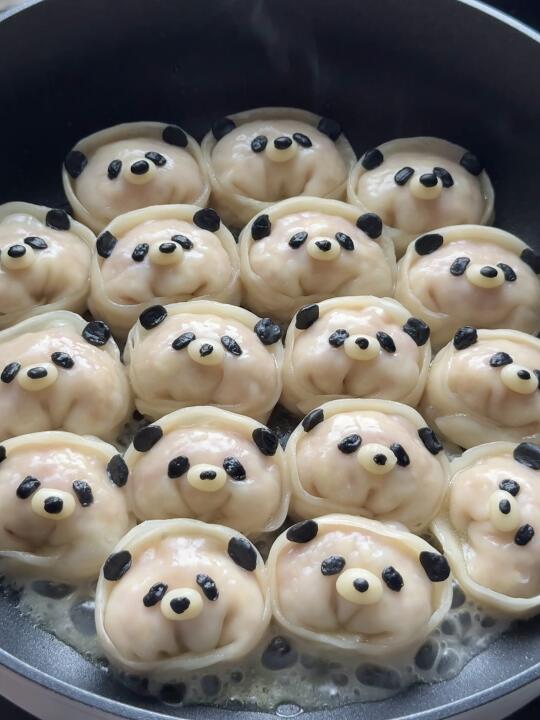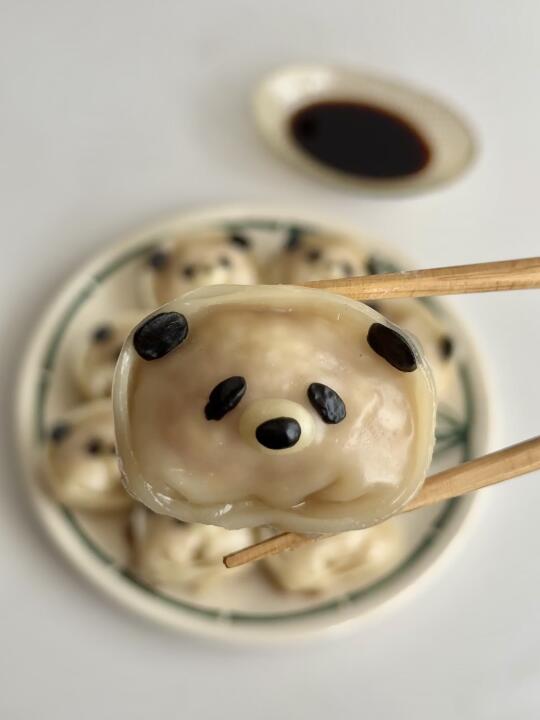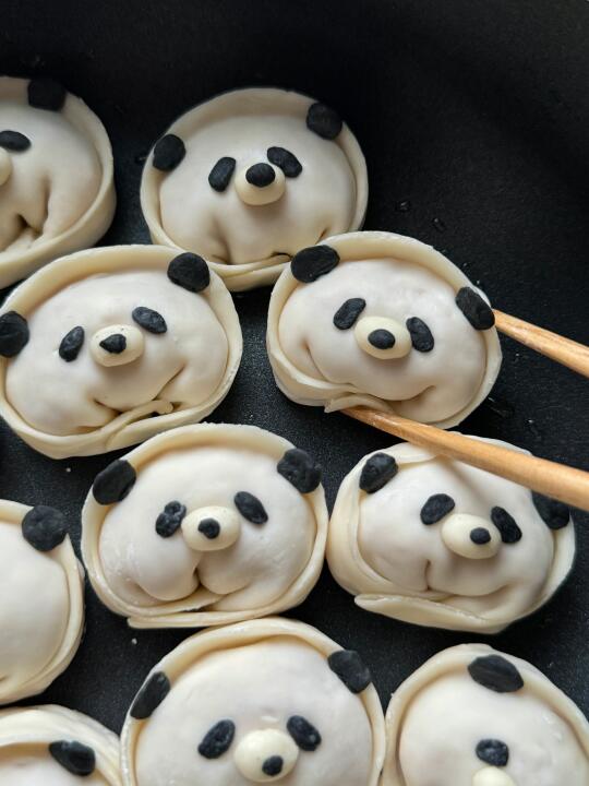 3️⃣饺子皮包入馅料,包成元宝的形状,表面沾水,用面团捏出熊猫表情