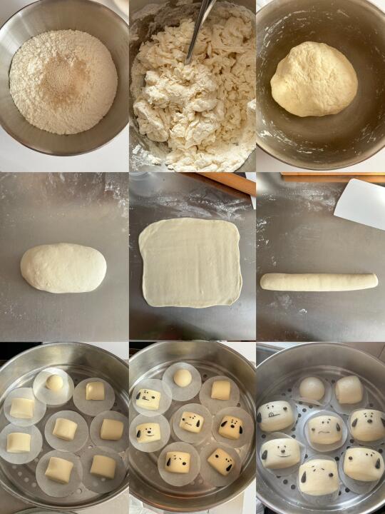 5️⃣分一小块面团出来加入竹炭粉调色,剩余的白色面团擀成长方形,表面刷上薄薄一层水后卷起来,用刀切小块,黑色面团做出史努比的表情