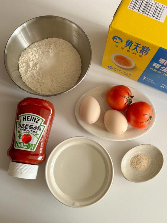 材料:中筋面粉150g、白糖5g、酵母1.5g、清水75g、番茄2个、黄天鹅鸡蛋2个、亨氏番茄酱