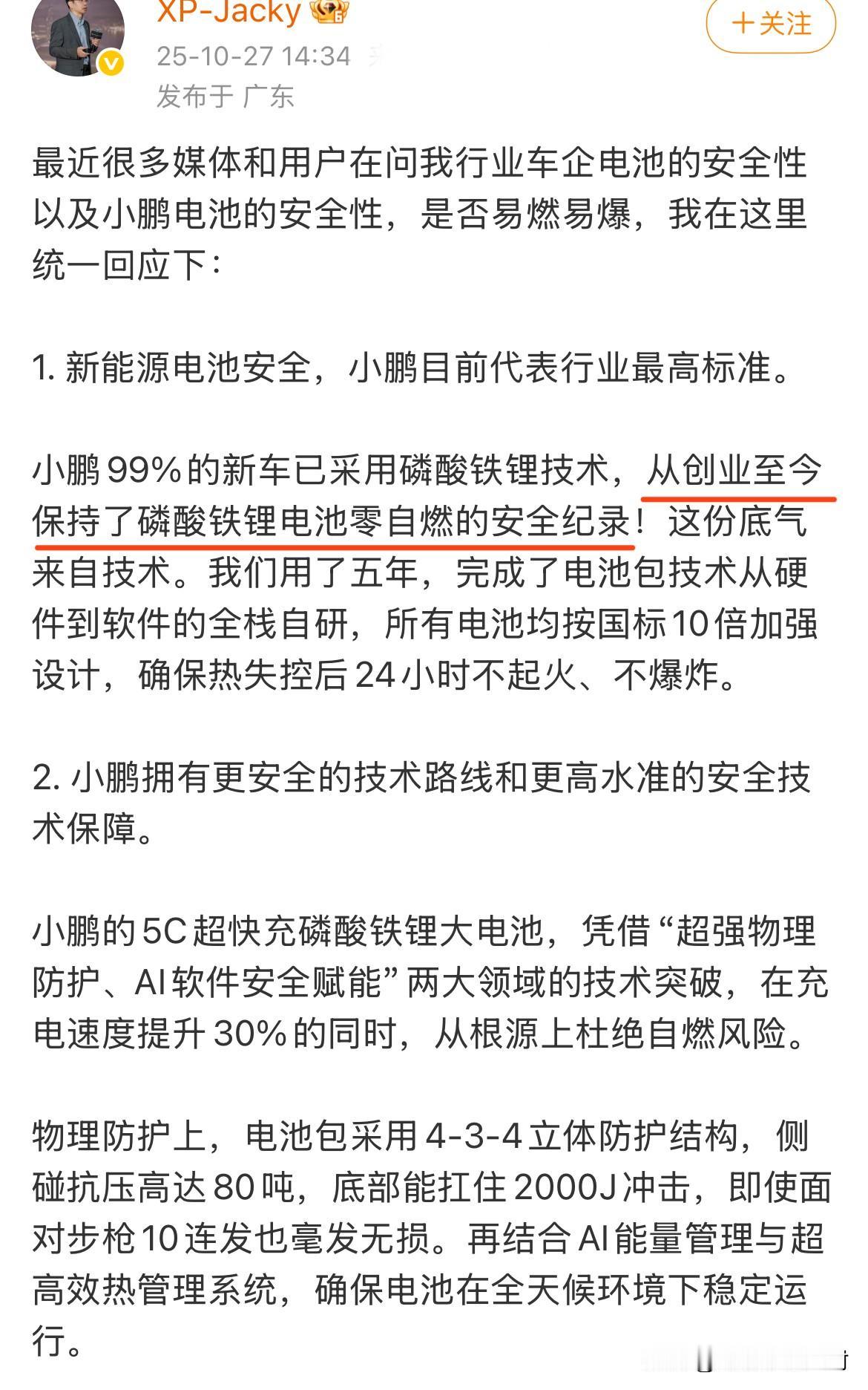 有点意思,小鹏在自家增程版X9的宣传海报海报上,明确使用“磷酸铁锂”电池(图一)。 这在以往好像是从没出现过的场面…… 磷酸铁锂电池虽然国内的装车量遥遥领先于三元锂电池,但一直给人中低端的印象,因此很少有厂家特意强调自己用的磷酸铁锂电池,尤其是高端车型,但小鹏这次主动说明增程版X9用的是磷酸铁锂电池。 而且自家高管也声称,小鹏从创业至今保持了磷酸铁锂电池零自燃的安全纪录(图二)。 现在还敢说“零自燃”的,真的不多了,很明显,小鹏此番也意在强调磷酸铁锂的安全性。 经此一役,磷酸铁锂恐怕要进一步挤压三元锂的市场空间了……